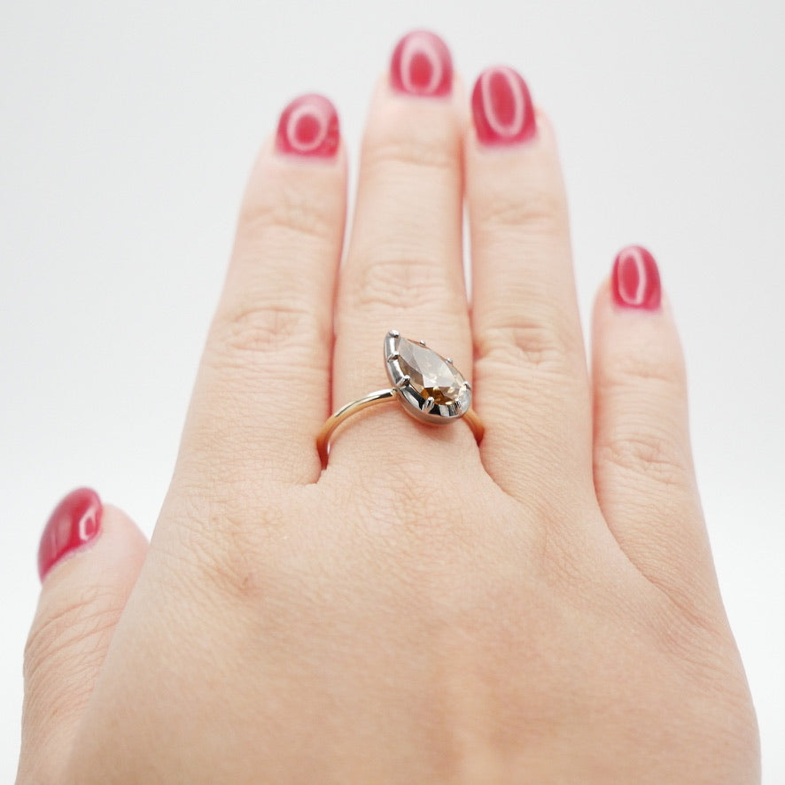 2.5 Carat Georgian Victorian Tilted Pear Brown Moissanite Ring in 14K Gold Button Collet Setting