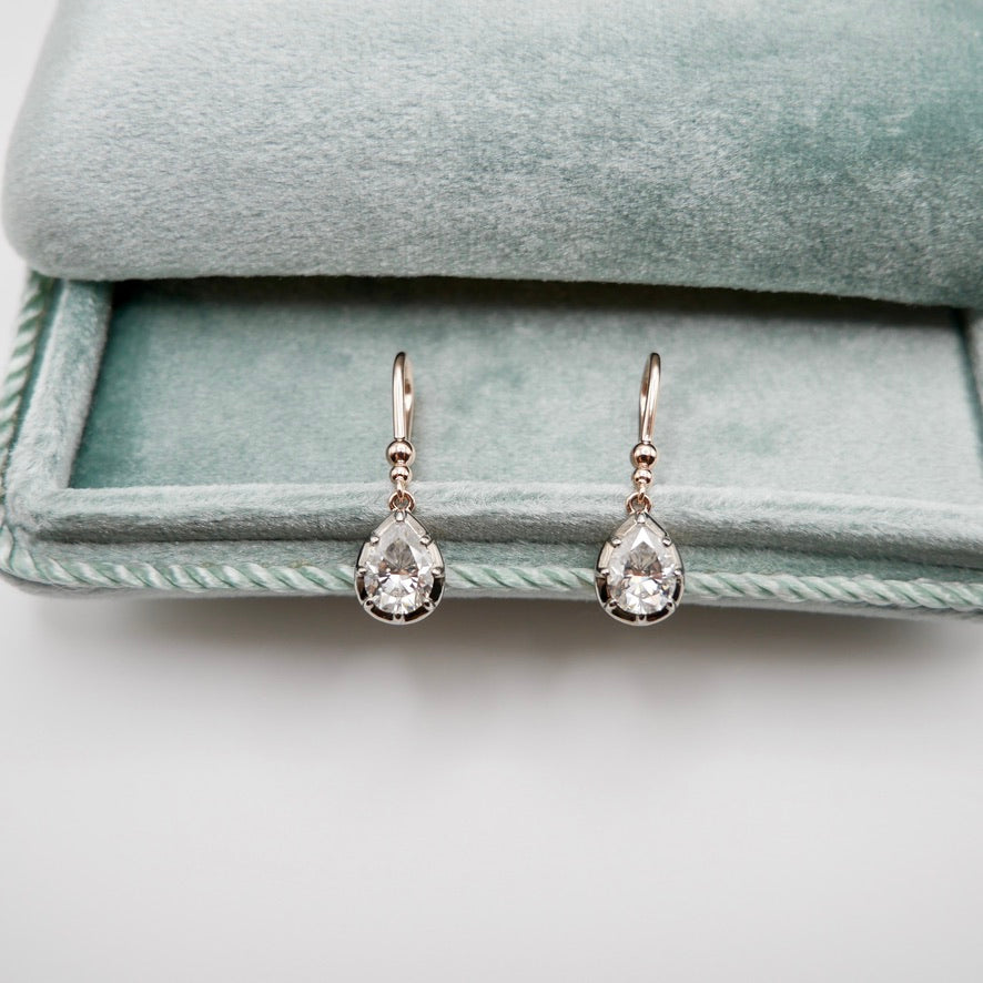 These 2 Ct Pear Moissanite Earrings are handcrafted in a unique mix of 14K rose gold and blackened gold. Each earring features a dazzling 1 ct pear-shaped moissanite, totaling 2 cts for the pair, set in a traditional Georgian collet setting. The design includes delicate hooks adorned with two small gold balls, enhancing the overall elegance. The open back setting of the moissanites allows light to enhance their brilliance, ensuring maximum sparkle. These earrings blend vintage charm with modern sophistication, making them perfect for special occasions or adding a touch of luxury to your everyday look.