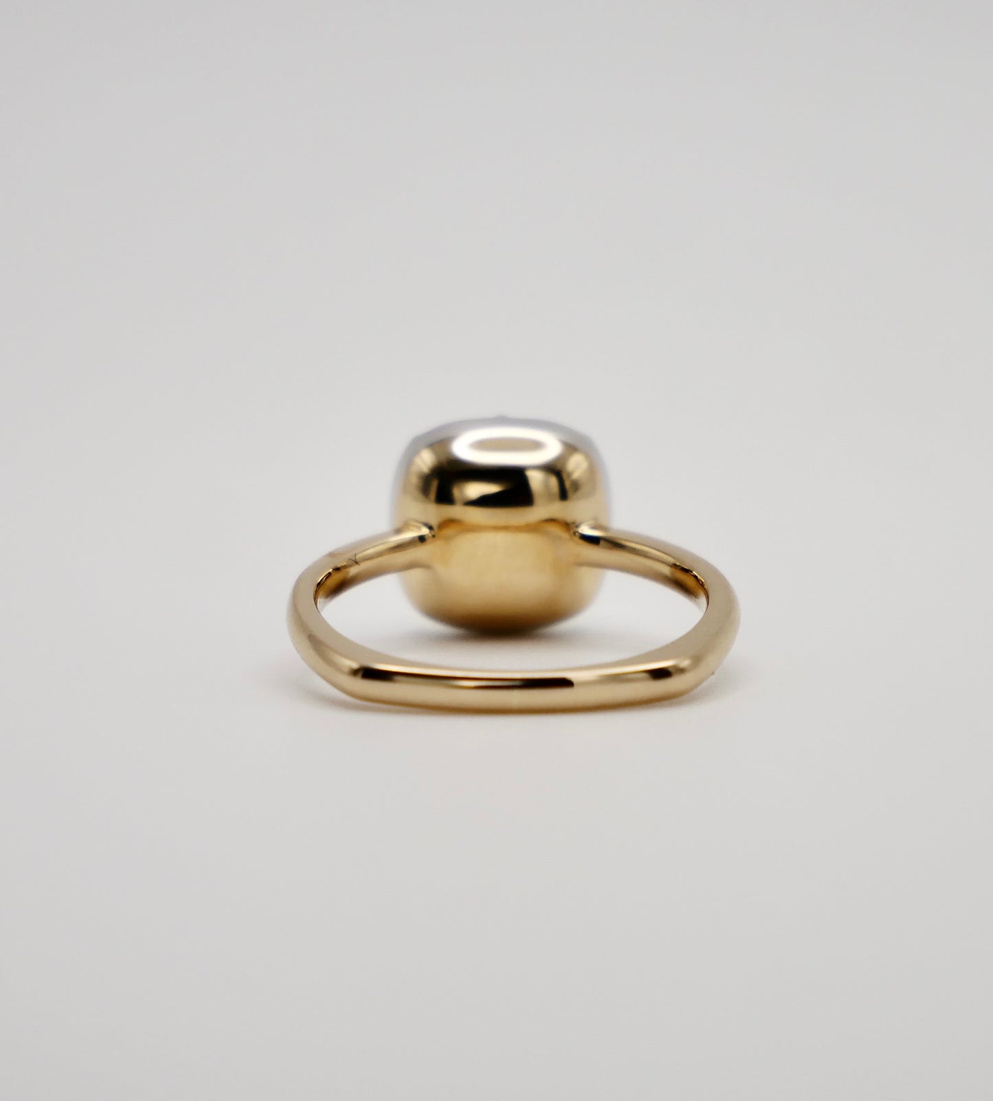 The 3.5 ct Old Mine Cut Georgian Victorian Moissanite Ring in White and Yellow Gold Collet Button Back setting is the perfect engagement ring which can then be stacked and layered with other styles. Set with a 3.5 ct old mine cut moissanite in a Georgian cut-down collet setting, the ring has a timeless modern aesthetic.