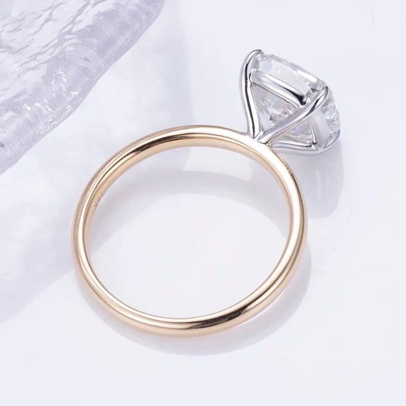 A 5-carat cushion-cut moissanite ring featuring a stunning moissanite stone set securely in a classic 14K white gold and yellow gold band. Its unique charm lies in the beautifully crafted tiger prongs that hold the moissanite securely in place. With a classic design, this ring is perfect for those who appreciate the beauty of simplicity and the brilliance of moissanite. Whether it's for an engagement or a special occasion, this ring will make a statement that lasts a lifetime.