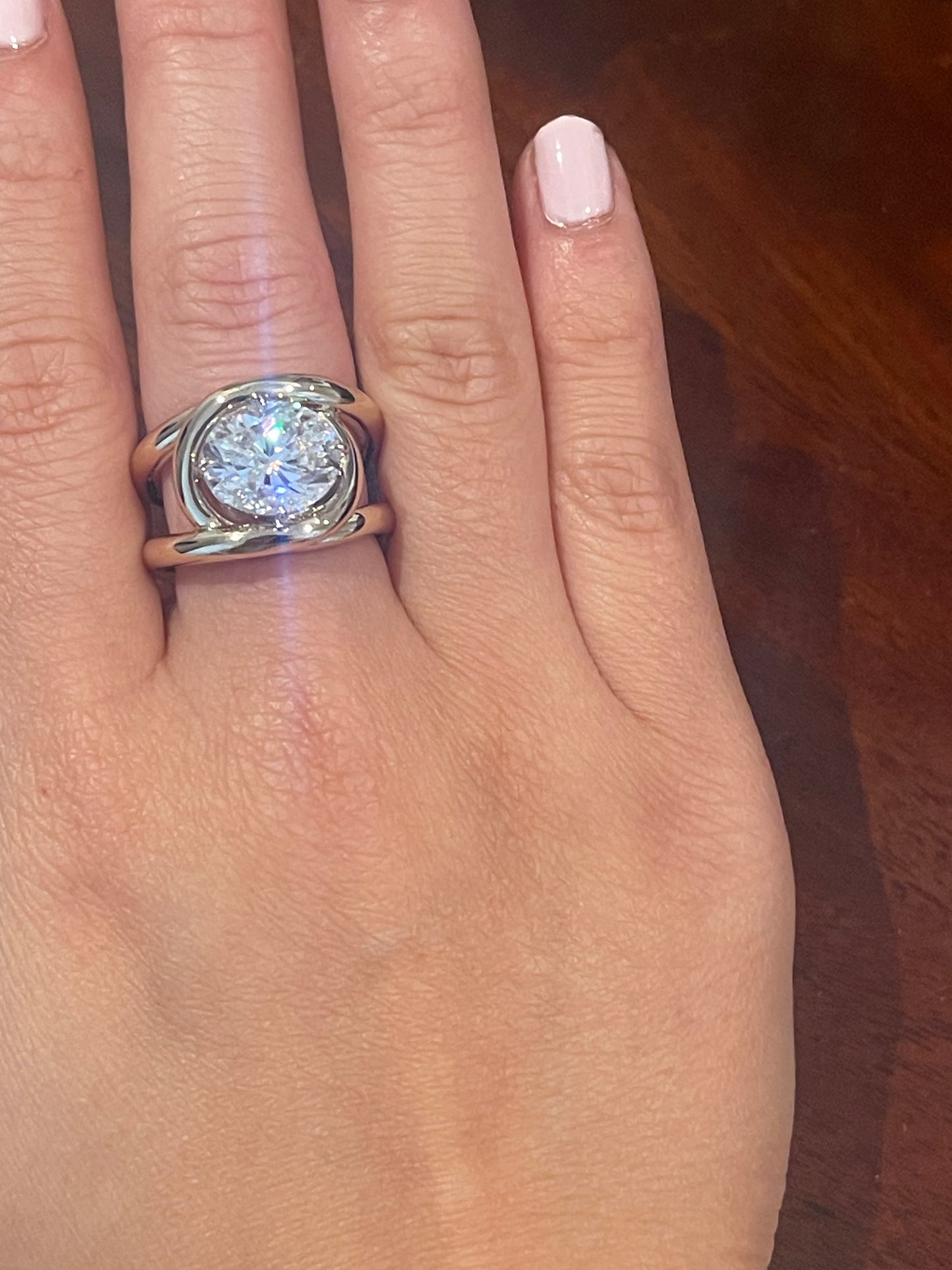 Indulge in vintage-inspired elegance with our Oval Ring, featuring a 3 or 5-carat oval moissanite cradled delicately in a dual-tone 14k yellow and white gold interlocking loops claw setting. This design pays homage to the timeless allure of 1950s French rings. The ring photographed features a 5 carat moissanite.
