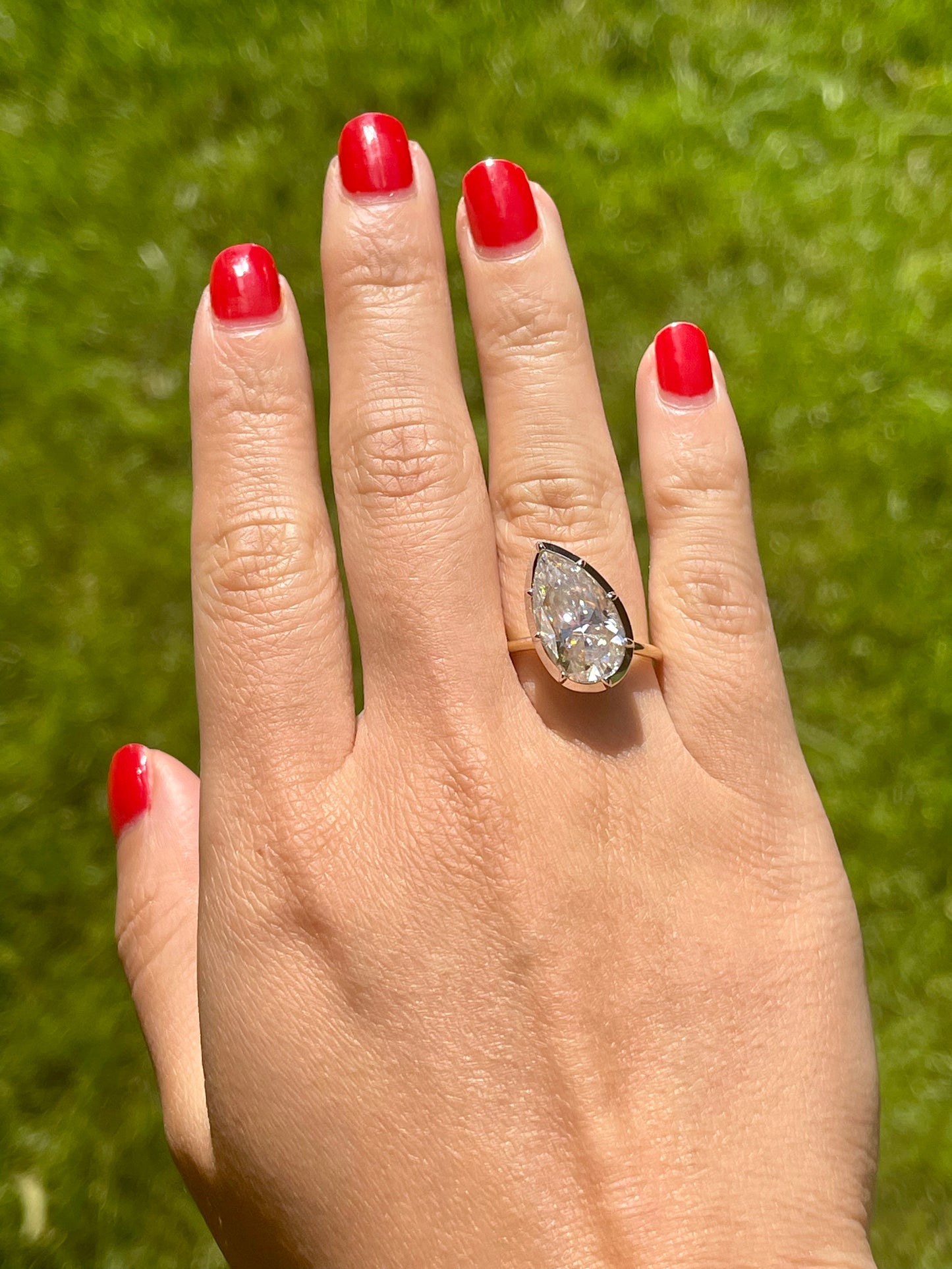 6 Carat Georgian Victorian Tilted Pear Moissanite Ring in 18K Gold Button Collet Setting