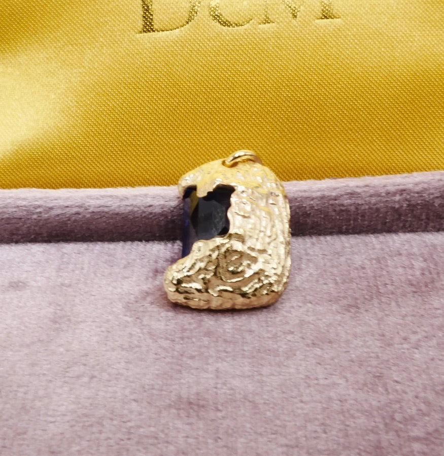This 6 carat baguette-cut lab-grown cornflower blue sapphire pendant is beautifully set in a uniquely sculpted yellow gold. Each pendant features a one-of-a-kind melted, hammered finish that gracefully wraps around the gemstone, leaving one side open to reveal the sapphire's full splendor and enhance its brilliance with abundant light. Available in 9K, 14K, and 18K gold, this pendant can be customized with any gemstone of your choosing, allowing you to create a personalized treasure that perfectly captures your style and spirit.