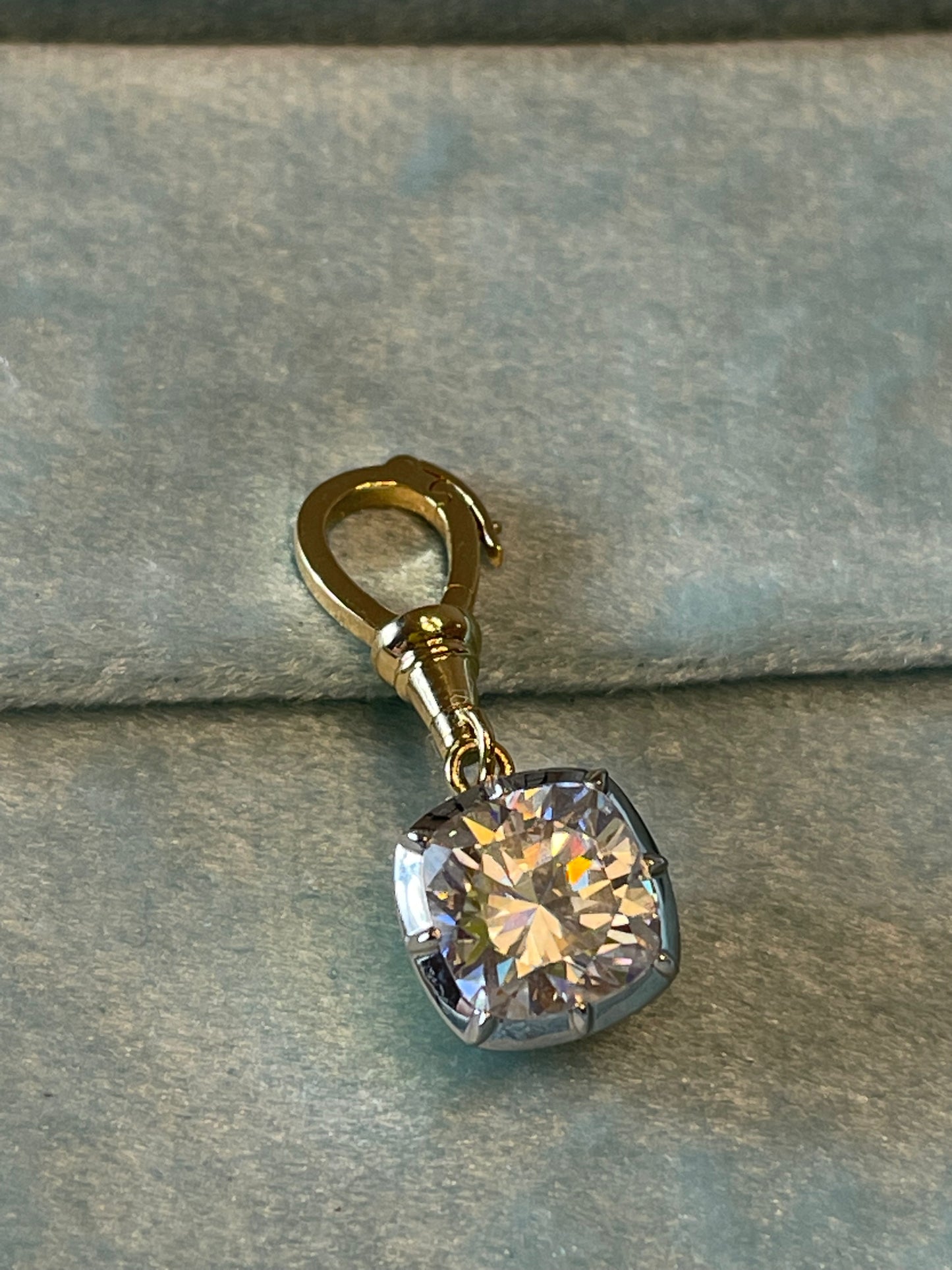 This Georgian Victorian Ball Chain Pendant is set with a 3.5 carat cushion shaped lab grown diamond or moissanite in a Georgian cut-down collet setting and is designed to hang from any of the ball chain necklaces. This pendant is a tribute to the intricate designs of the past, showcasing a delicate pendant that exudes timeless charm. The pendant is handcrafted in 18k white gold and 18k yellow gold, which is designed with versatility in mind.