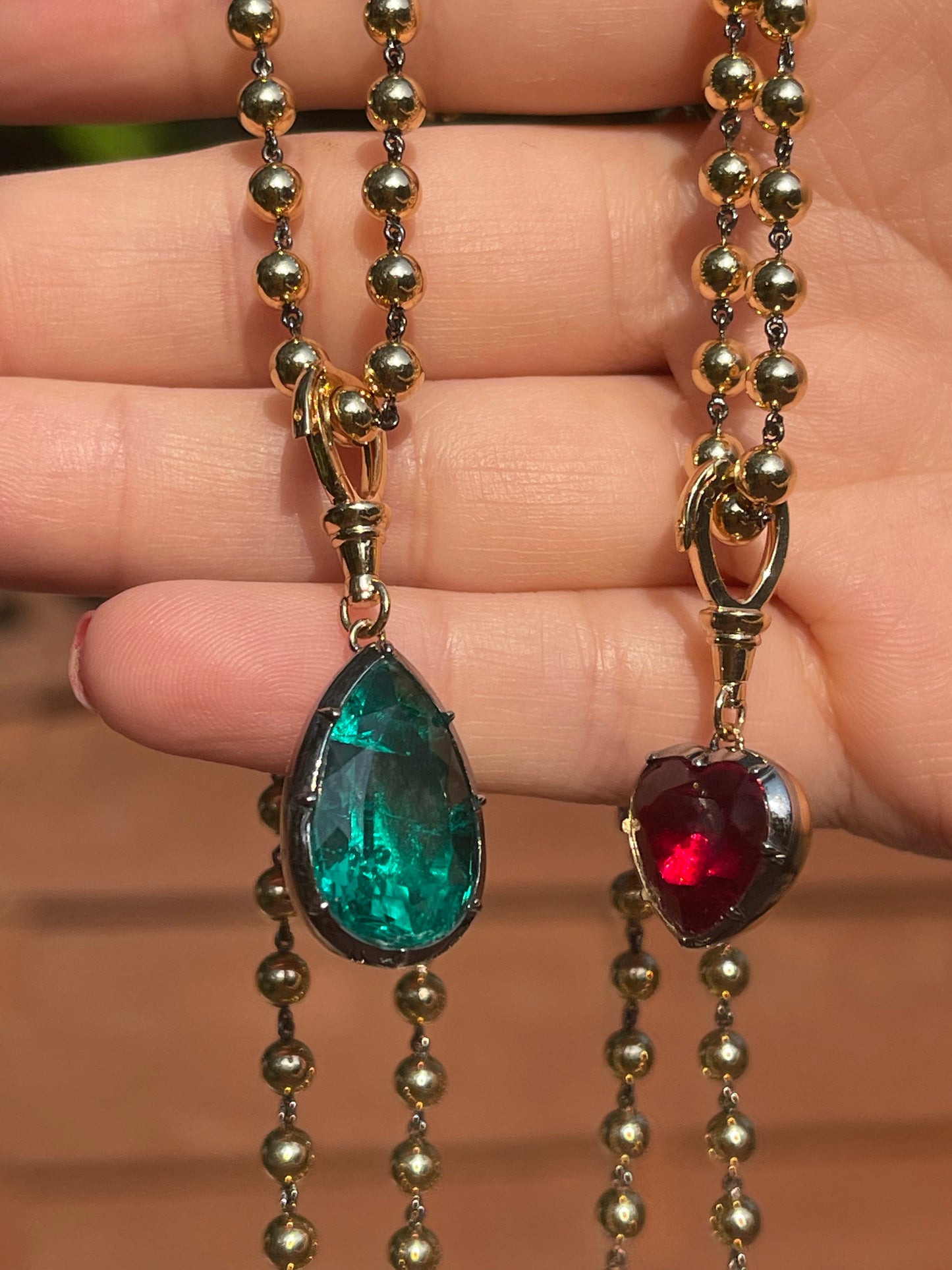 This Georgian Victorian Ball Chain Pendant is set with a 5 carat heart shaped lab ruby (11 x 11 mm) in a Georgian cut-down down setting and is designed to hang from any of the ball chain necklaces.
