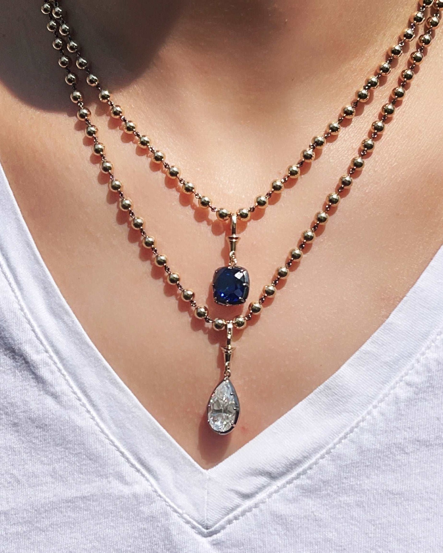The Georgian Victorian 4 Carat Cushion Shaped Lab Grown Sapphire Pendant is set in an Antique Inspired Georgian cut-down collet setting and is designed to hang from any of the ball chain necklaces. The pendant is handcrafted in 18k blackened gold and 18k yellow gold, which is designed with versatility in mind.