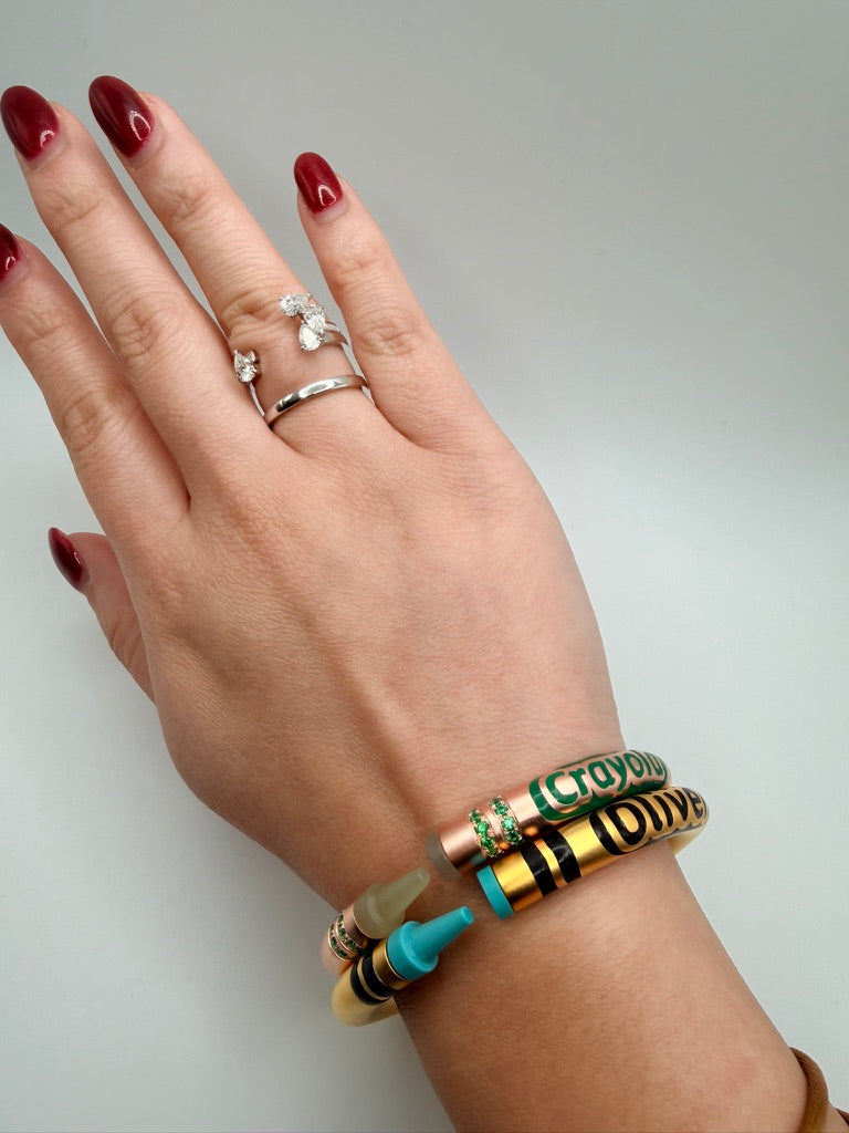 This whimsical bracelet transforms the classic coloring stick into a sophisticated statement piece, featuring genuine green nephrite/jade tips and sparkling lab-grown emerald accent bands on 18K gold-filled metal. The magic lies in complete customization - personalize the wrapper with any name or word, and choose your preferred gemstone colors for both tips and accents. The hinged design opens smoothly for easy wear while maintaining the playful illusion of a real artist's tool. Perfect for teachers, creatives, or anyone who believes in coloring outside the lines, this bracelet brings childhood nostalgia to luxury jewelry. Each piece is individually crafted to your specifications, making it as unique as your imagination.