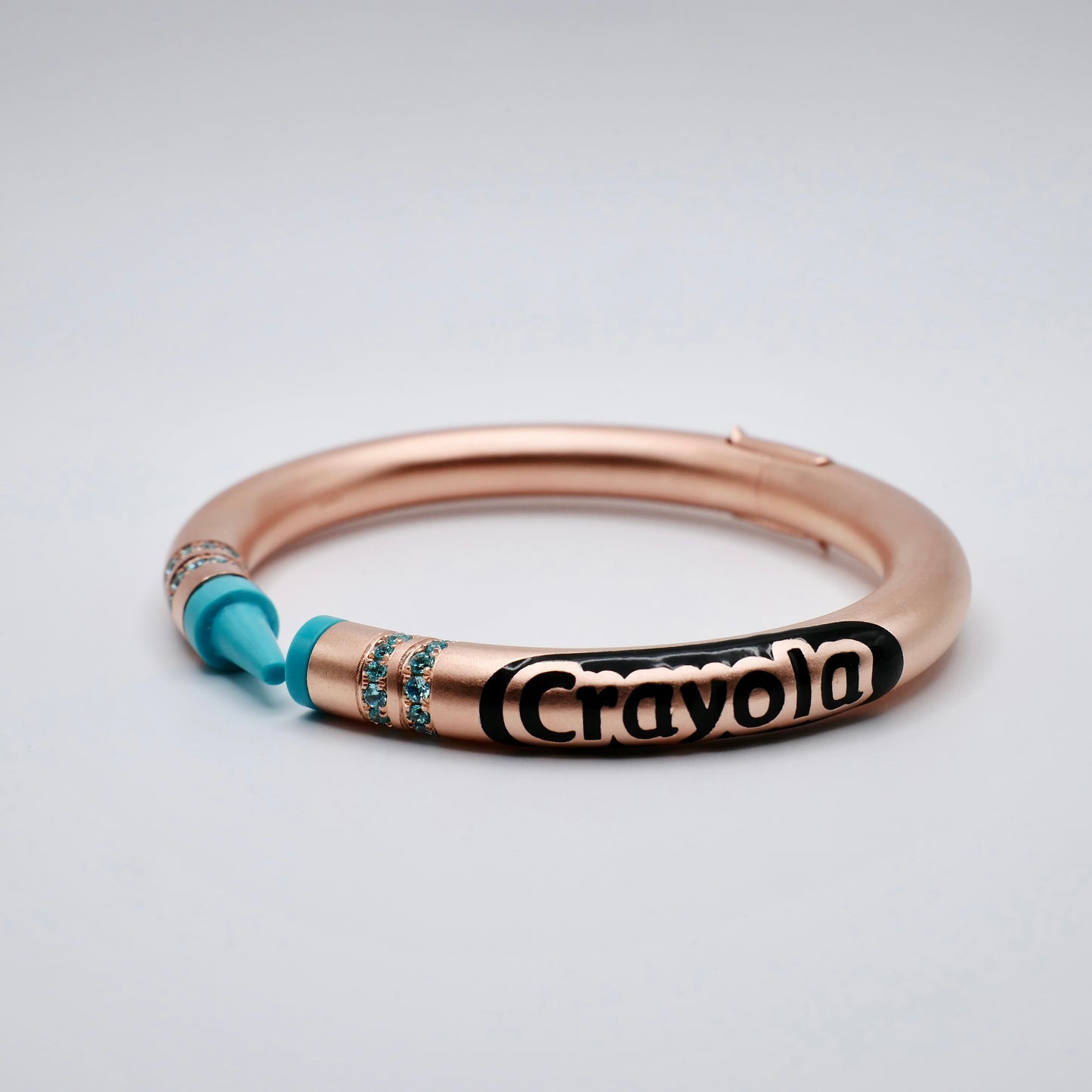 This whimsical bracelet transforms the classic coloring stick into a sophisticated statement piece, featuring genuine turquoise tips and sparkling turquoise moissanites accent bands on 18K gold-filled metal. The magic lies in complete customization - personalize the wrapper with any name or word, and choose your preferred gemstone colors for both tips and accents. The hinged design opens smoothly for easy wear while maintaining the playful illusion of a real artist's tool. Perfect for teachers, creatives, or anyone who believes in coloring outside the lines, this bracelet brings childhood nostalgia to luxury jewelry. Each piece is individually crafted to your specifications, making it as unique as your imagination.