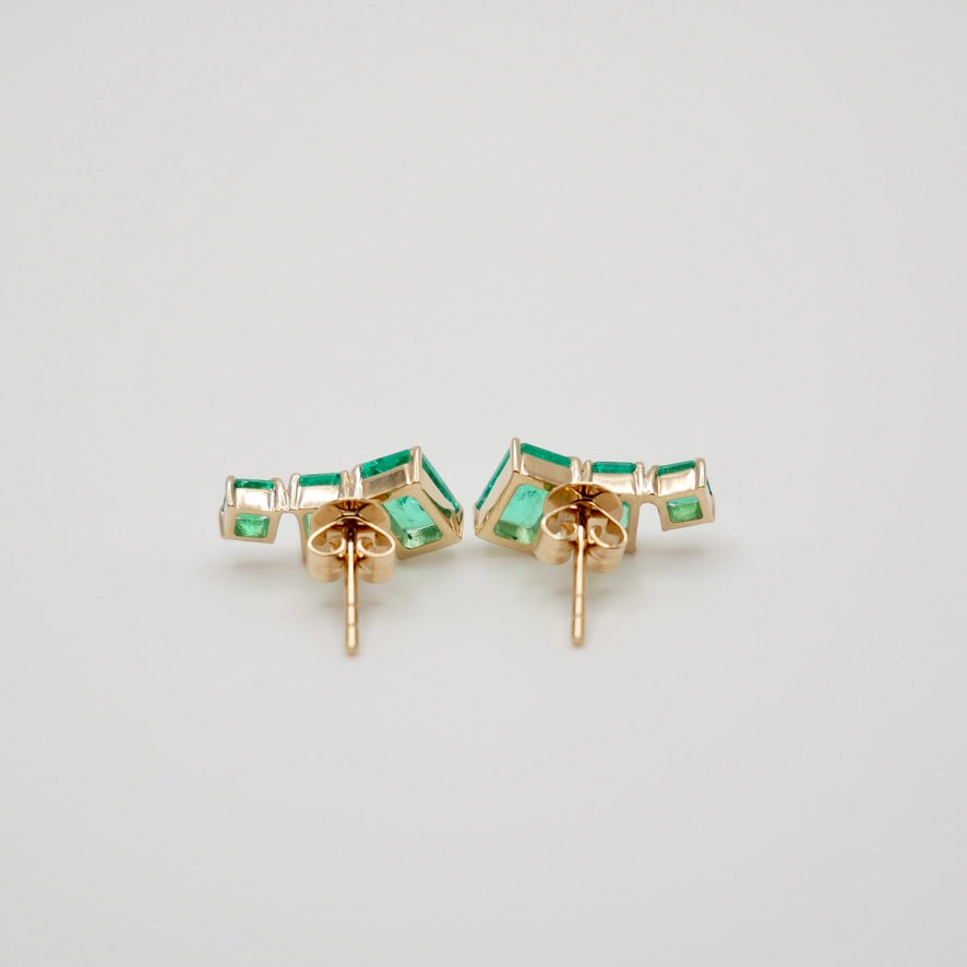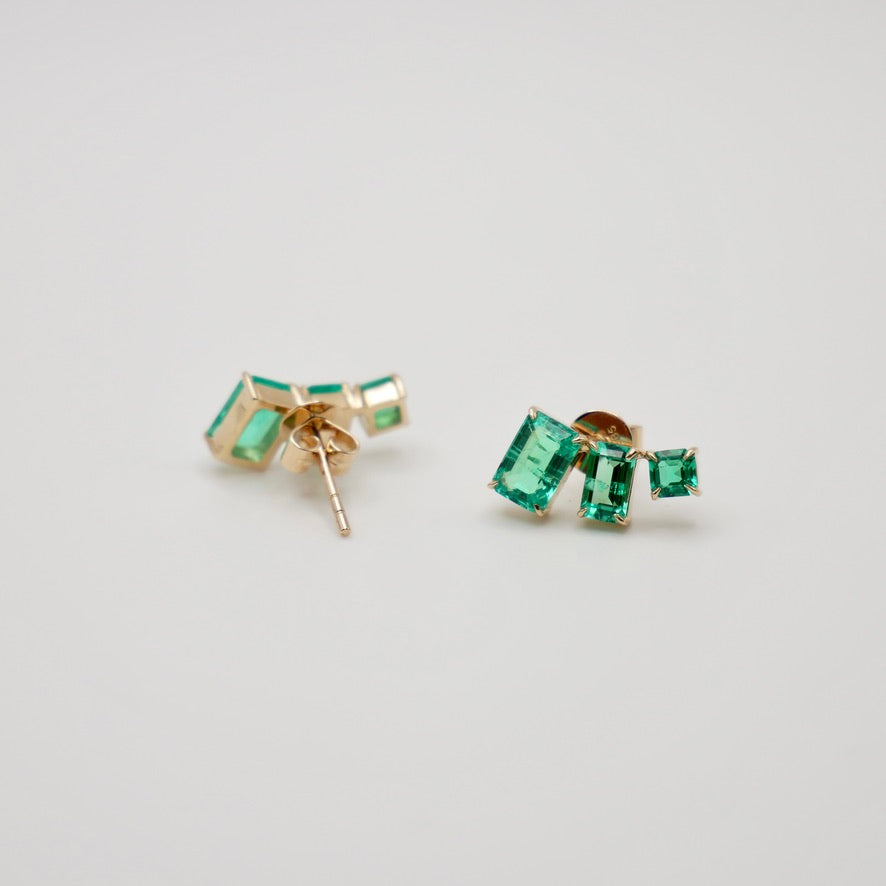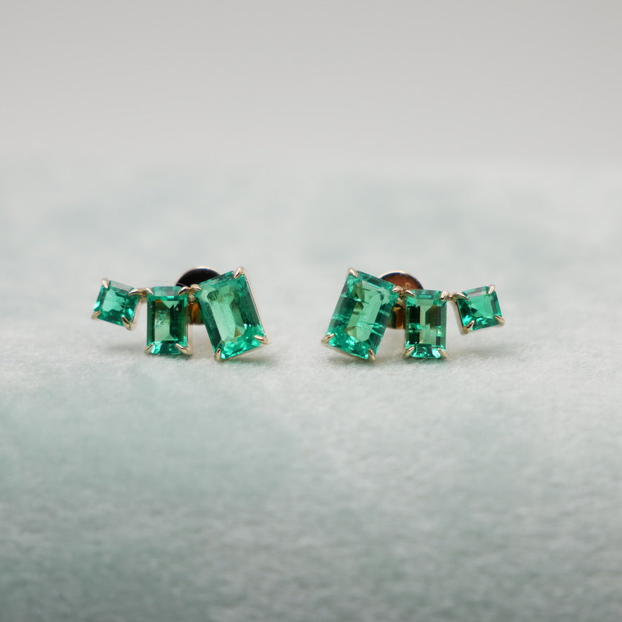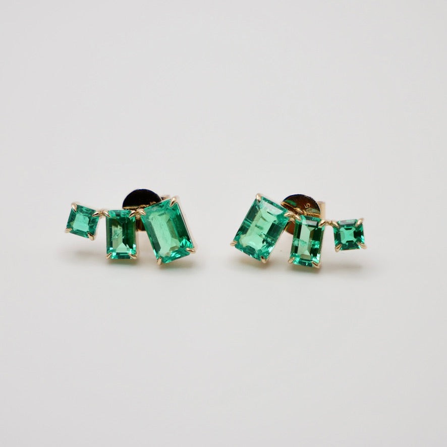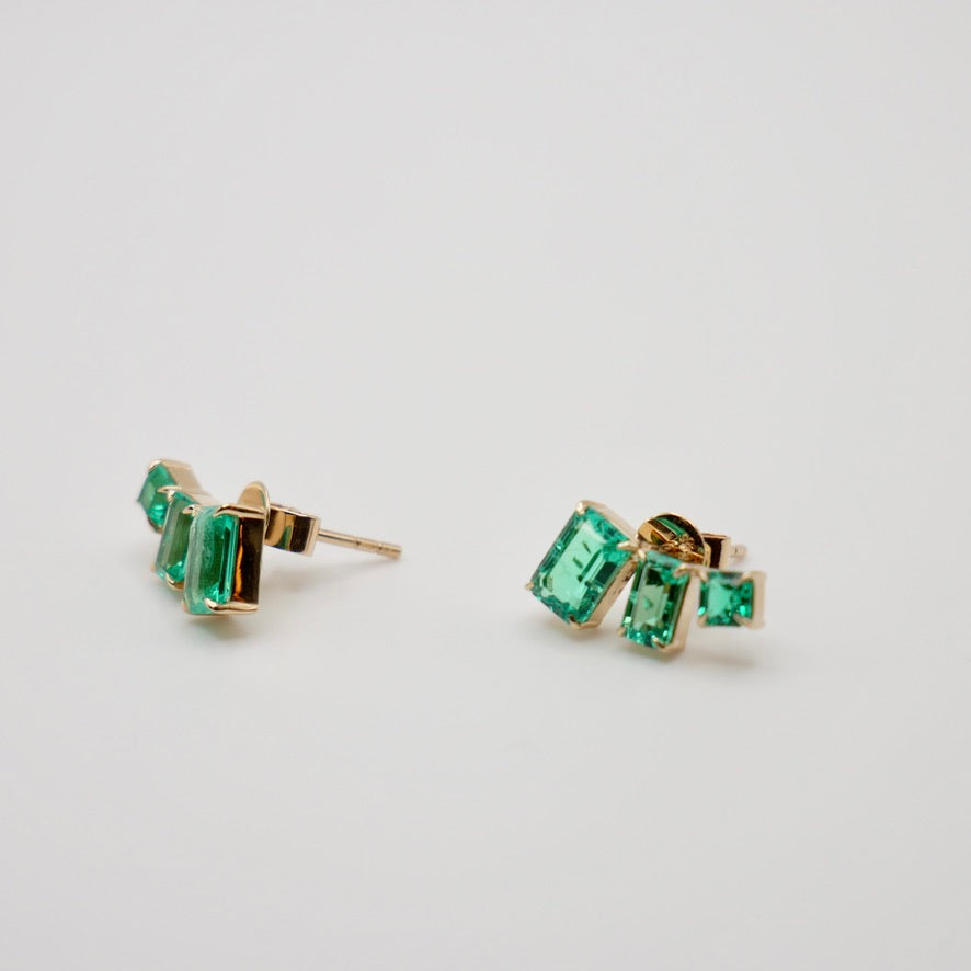 These striking ear climbers showcase a trio of emerald-cut lab-grown emeralds in graduating sizes, creating an elegant cascade of vibrant green along the ear. Each earring features three precisely cut stones - a smaller square emerald, followed by two larger rectangular emerald cuts - all prong-set in polished 14K yellow gold. The warm golden setting beautifully complements the rich green hue of the lab-grown emeralds, creating a luxurious contrast.
