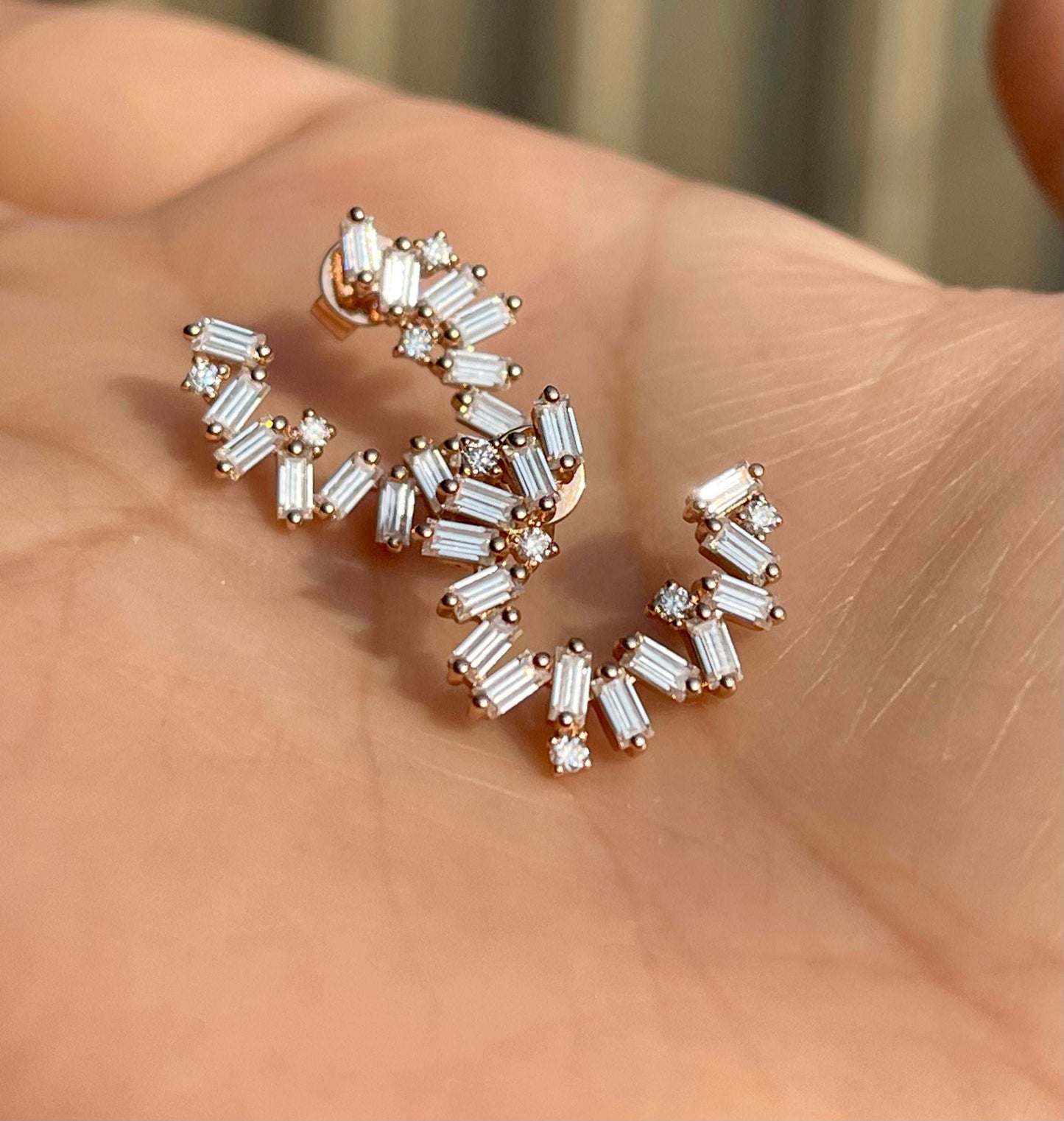 A pair of beautiful flat hoop earrings are set with baguette-cut moissanites and round moissanites in 18K gold. Set with approximately 1.25 carats of moissanites.