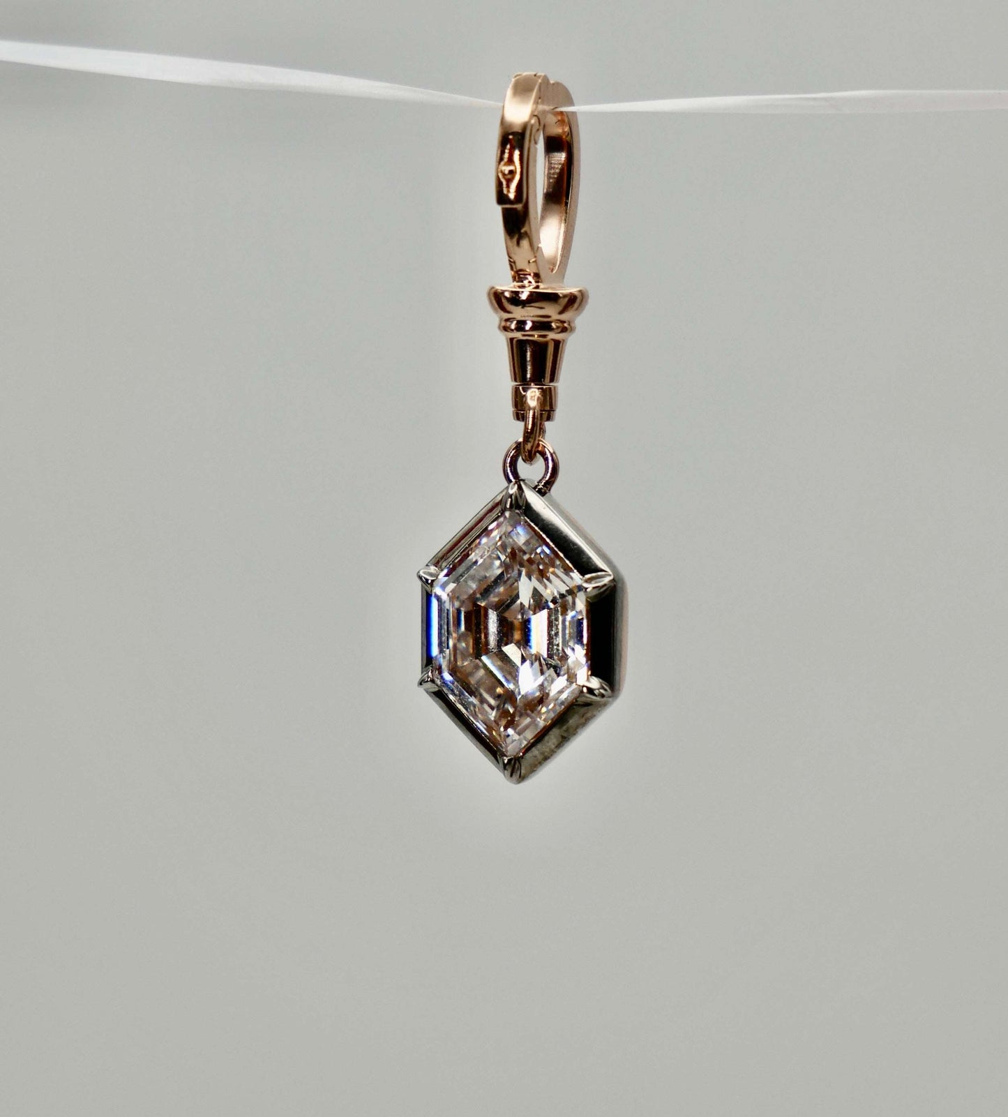 This Georgian Victorian Ball Chain Pendant is set with a 3 carat north-west hexagon shaped lab diamond or moissanite in a Georgian cut-down collet setting and is designed to hang from any of the ball chain necklaces. This pendant is a tribute to the intricate designs of the past, showcasing a delicate pendant that exudes timeless charm. The pendant is handcrafted in 18k blackened white gold and 18k yellow gold, which is designed with versatility in mind.
