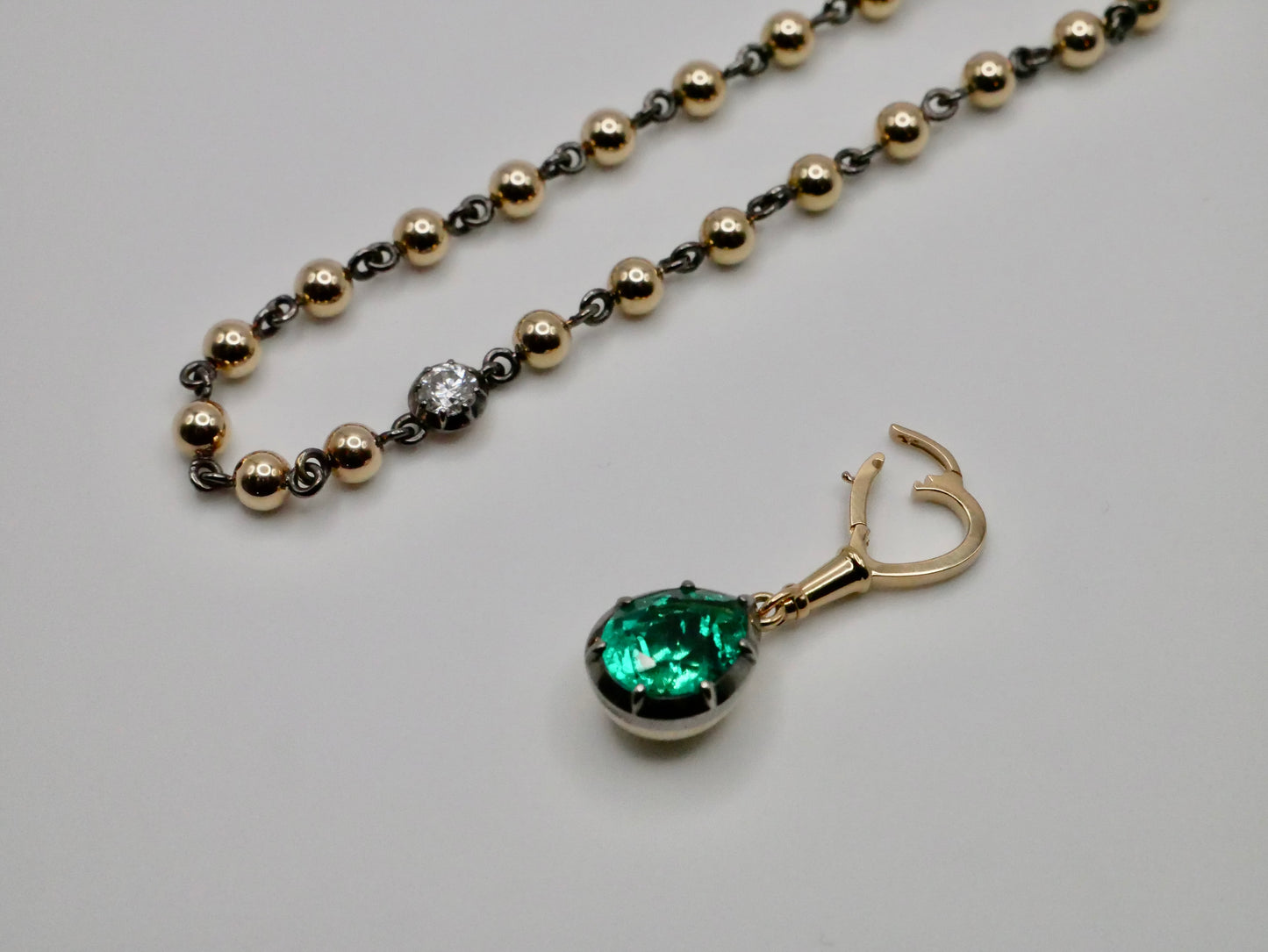 The Georgian Victorian Ball Chain Pendants are set with cushion, pear, round or oval stones in a Georgian cut-down collet setting and is designed to hang from any of the ball chain necklaces. The pendants are handcrafted in 18k blackened gold and 18k yellow gold, which is designed with versatility in mind.