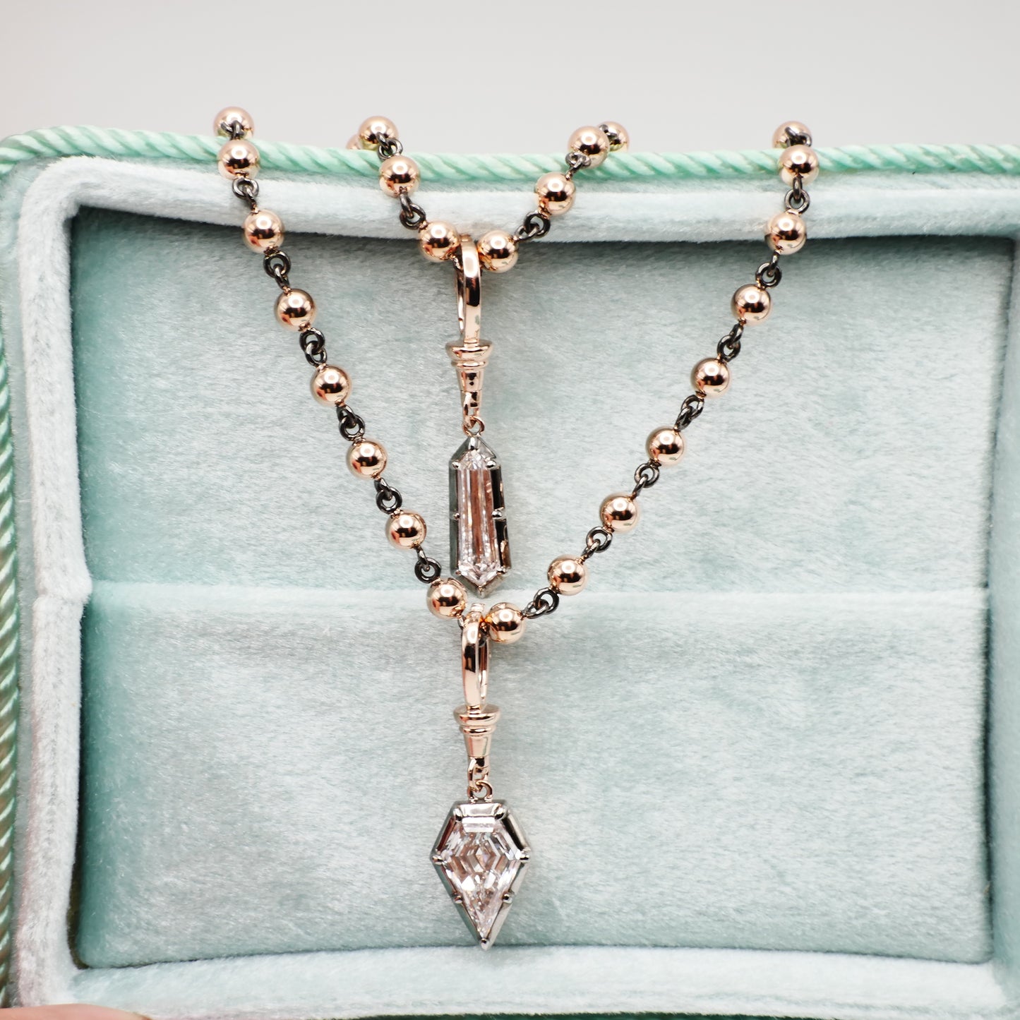 This Georgian Victorian Ball Chain Pendant is set with an elongated 2.5 carat kite shaped diamond in a Georgian cut-down setting and is designed to hang from any of the ball chain necklaces. The pendant is handcrafted in 14k blackened gold and 14k rose gold, which is designed with versatility in mind.