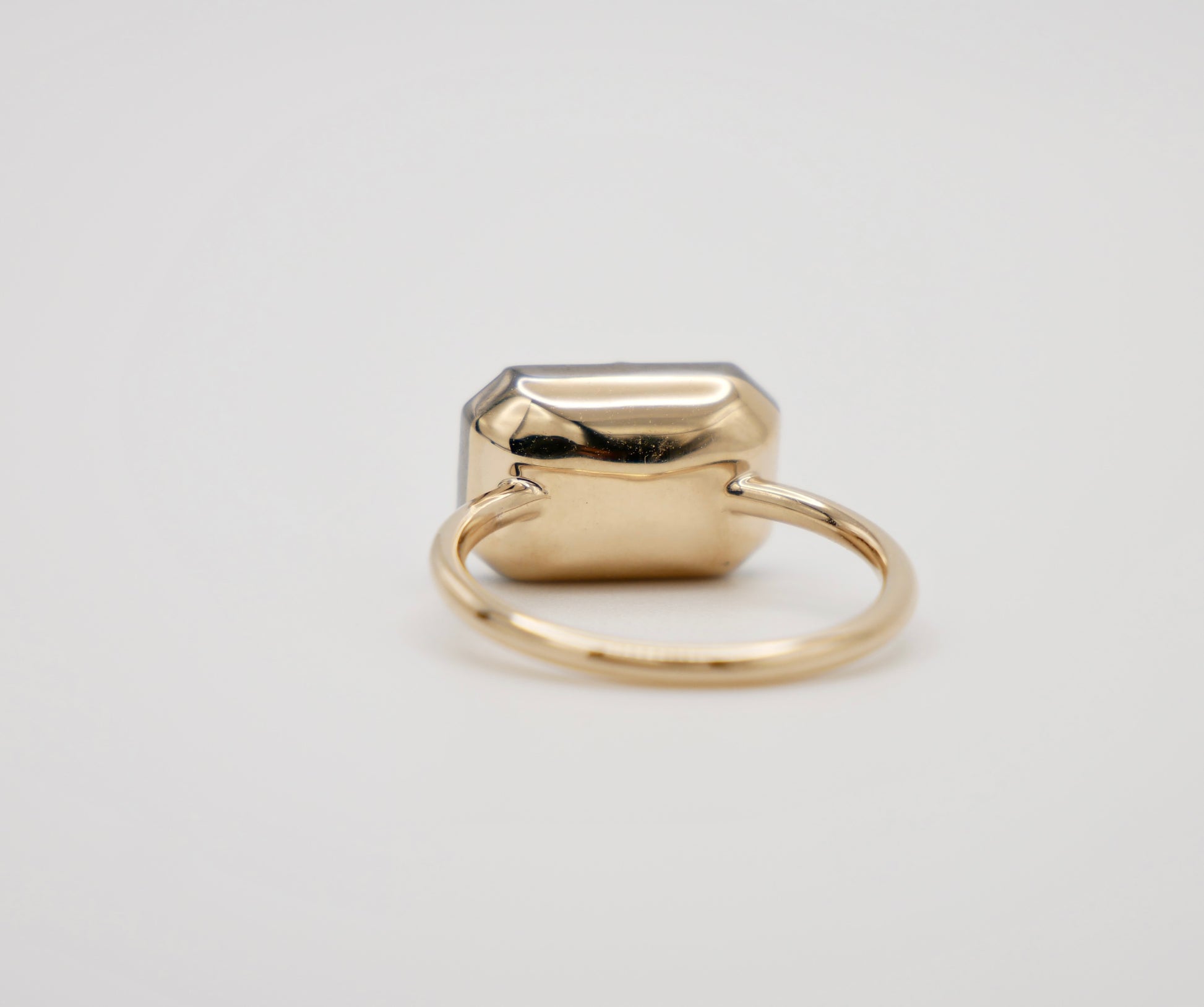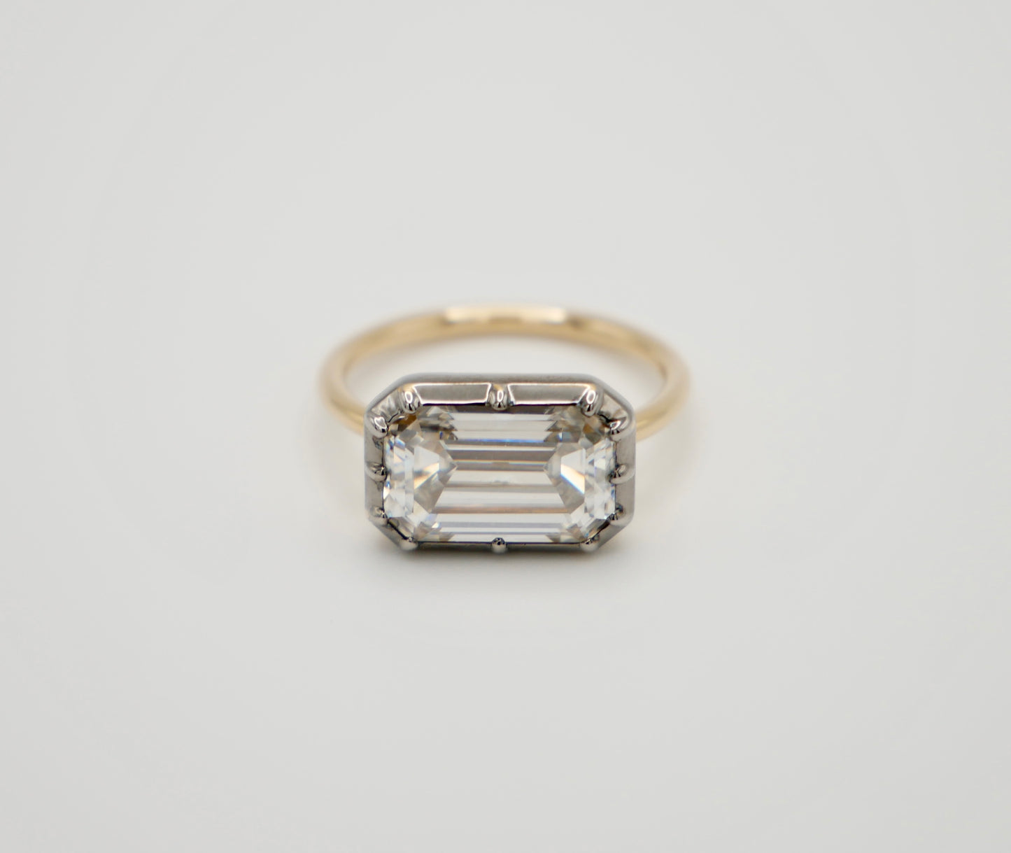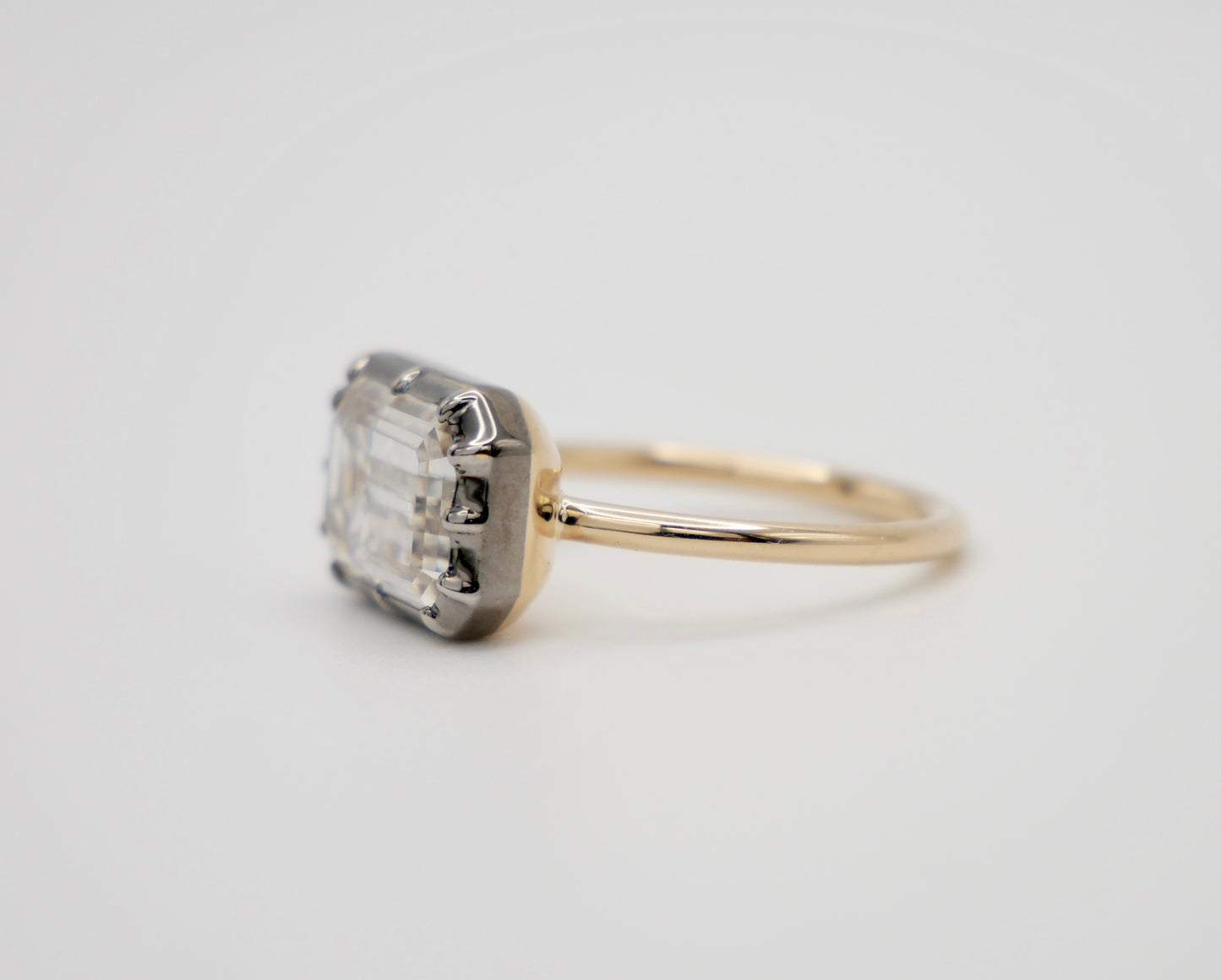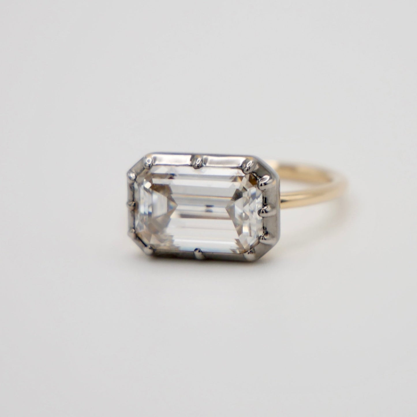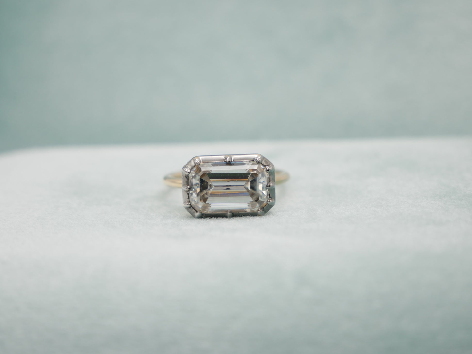 Georgian Victorian Elongated Emerald Cut Moissanite Button Back Collet Ring