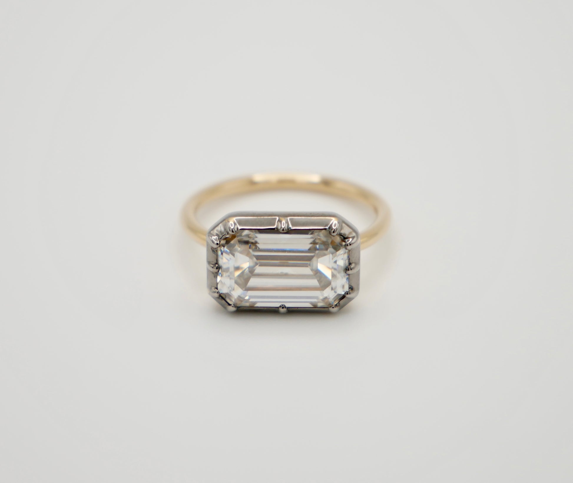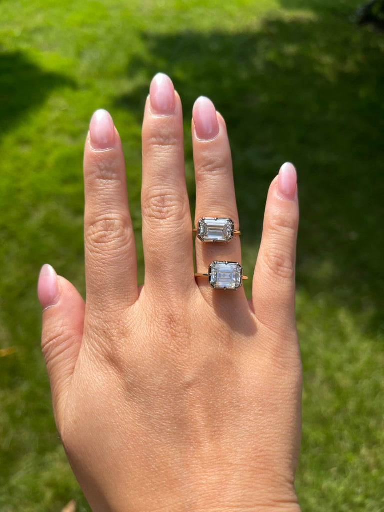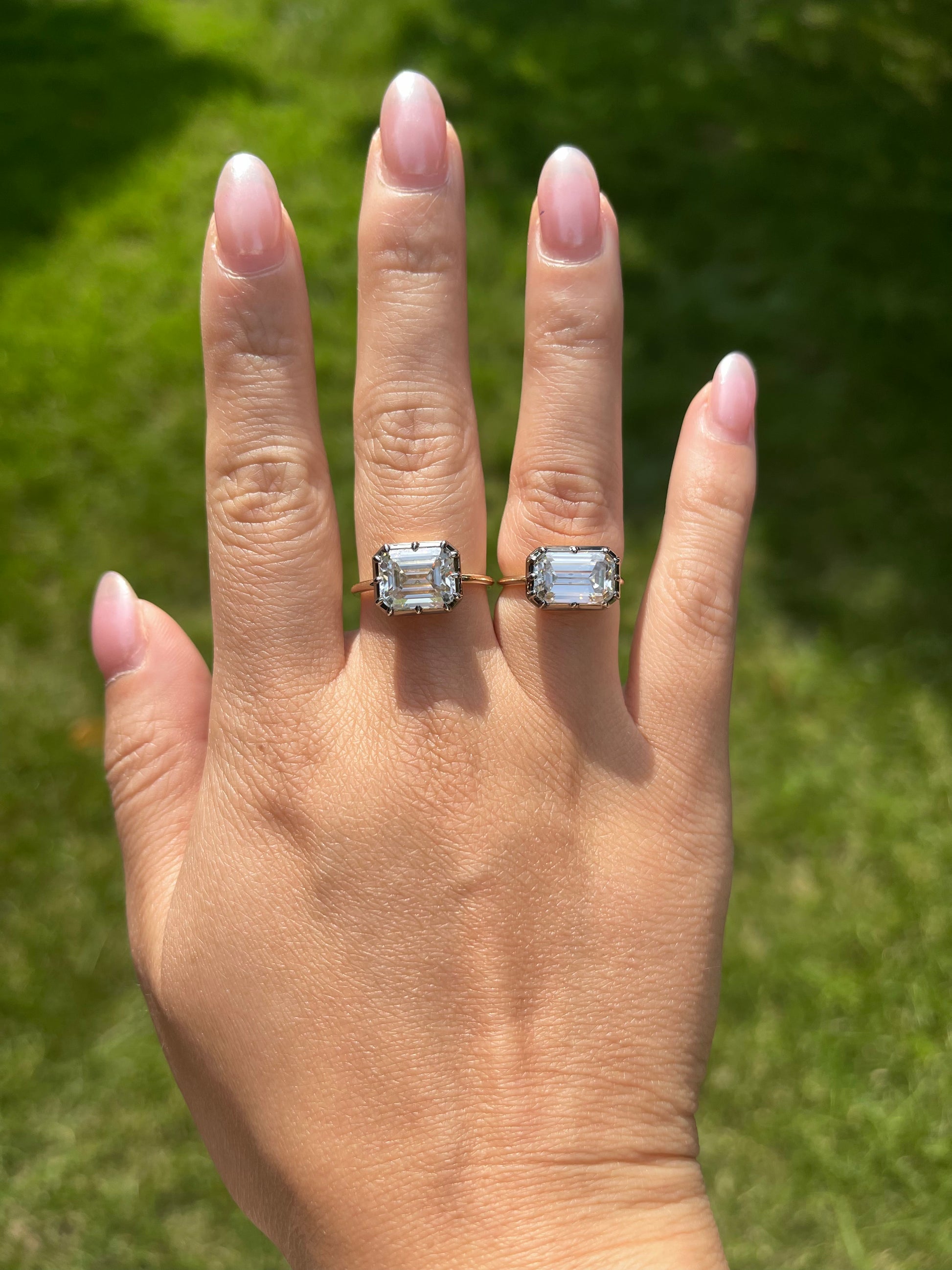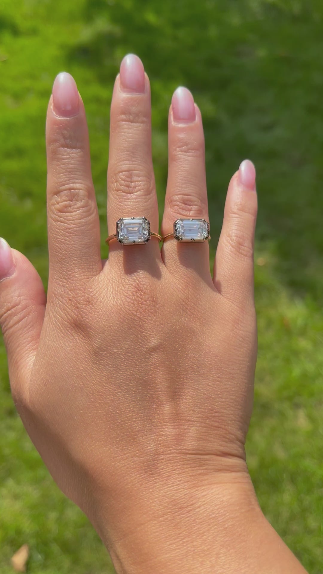 The Georgian-Victorian Elongated Emerald Cut Moissanite & Blackened Gold East West Button Back Collet Ring—a timeless engagement piece inspired by the grace of the Georgian and Victorian periods. This ring, featuring a stunning 3.5 ct moissanite in a Georgian cut-down collet setting and button back, exudes a timeless yet modern charm. It's not just an engagement ring; it's a versatile piece designed for stacking and layering with other styles.The ring photographed is a 3.5 carat in a US Size 6 1/2.