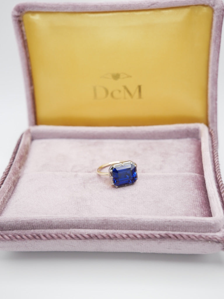Georgian Victorian Emerald Cut Blue Sapphire Button Back Collet Ring