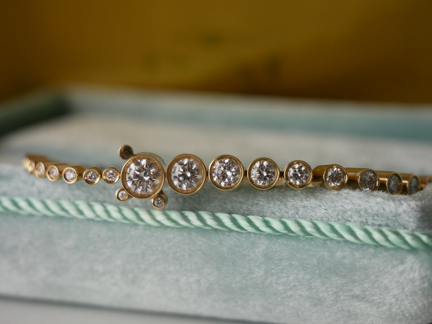 A Graduating Tennis Bracelet, a stunning embodiment of sophistication and elegance. This exceptional bracelet features a mesmerizing sequence of 2.64 cts of lab grown diamonds or moissanites, meticulously set in a bezel setting, with each stone graduating from largest to smallest. The result is a unique piece that captivates with its subtly changing sizes, creating a dynamic and luxurious aesthetic. Choose between solid gold or gold-filled options, both offering enduring beauty, and adorn your wrist with the brilliance of lab diamonds or the dazzling allure of moissanites. Sophie Bille Brahe Diamond Tennis Bracelet