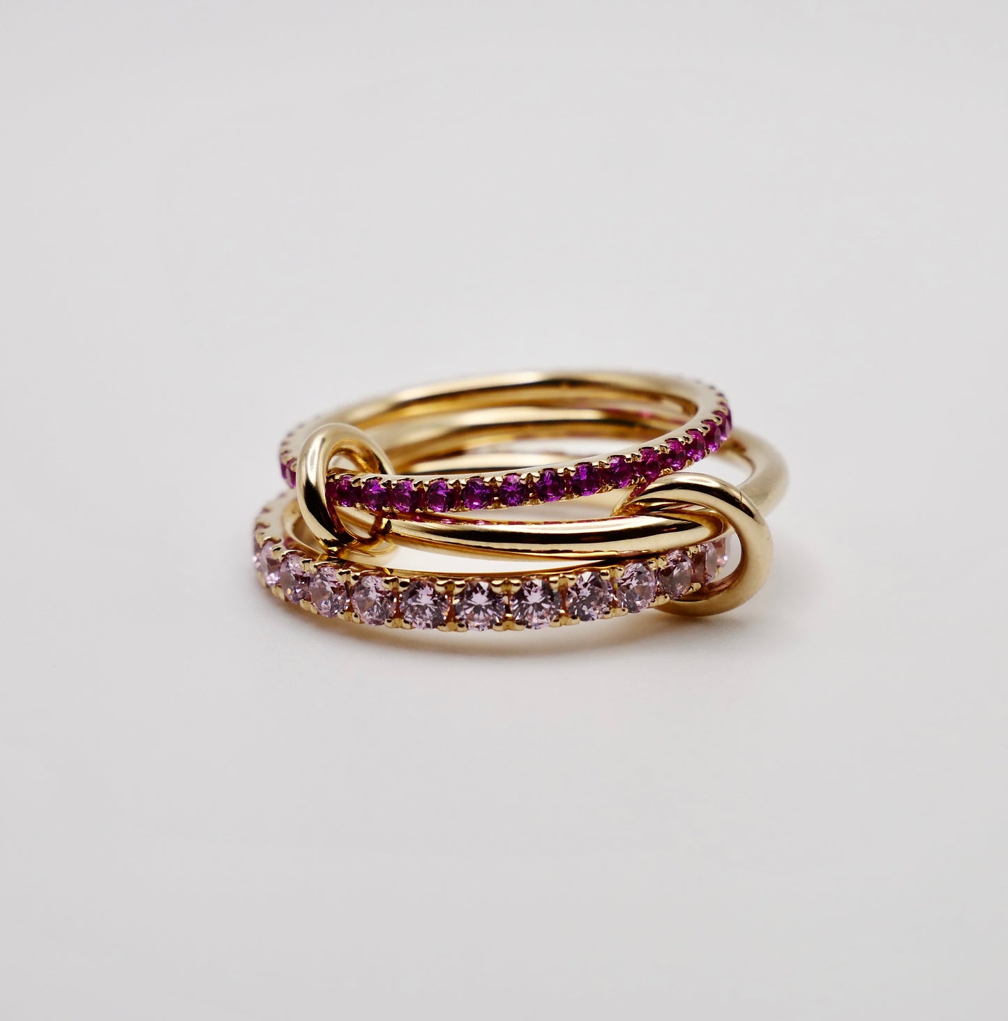 Discover the art of connection with our stunning interlocking trinity ring set, where three individual bands unite in perfect harmony. Each band is meticulously crafted in warm 14K yellow gold and adorned with brilliant lab-grown sapphires in vibrant pink and pastel pink hues. The innovative interlocking design allows you to wear all three together for maximum impact. Whether worn as a symbol of unity or simply for its captivating beauty, this trinity set transforms any jewelry collection.