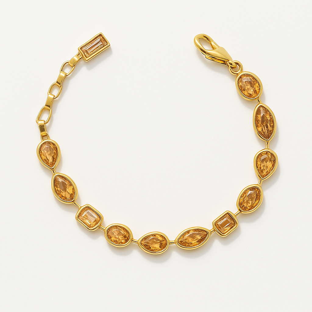 Radiate warmth and sophistication with our "Golden Honey" bracelet, a stunning piece that captures light and attention with every movement. This elegant design features a captivating array of champagne moissanites in varying cuts—oval, emerald, and marquise—each bezel-set in lustrous gold for maximum brilliance. Available in your choice of 18K gold filled for everyday luxury or 18K solid gold for the ultimate indulgence, this bracelet combines contemporary style with timeless appeal. The champagne moissanites sparkle with rich amber tones, beautifully complementing the warm gold setting and creating a versatile piece that transitions effortlessly from day to evening wear.