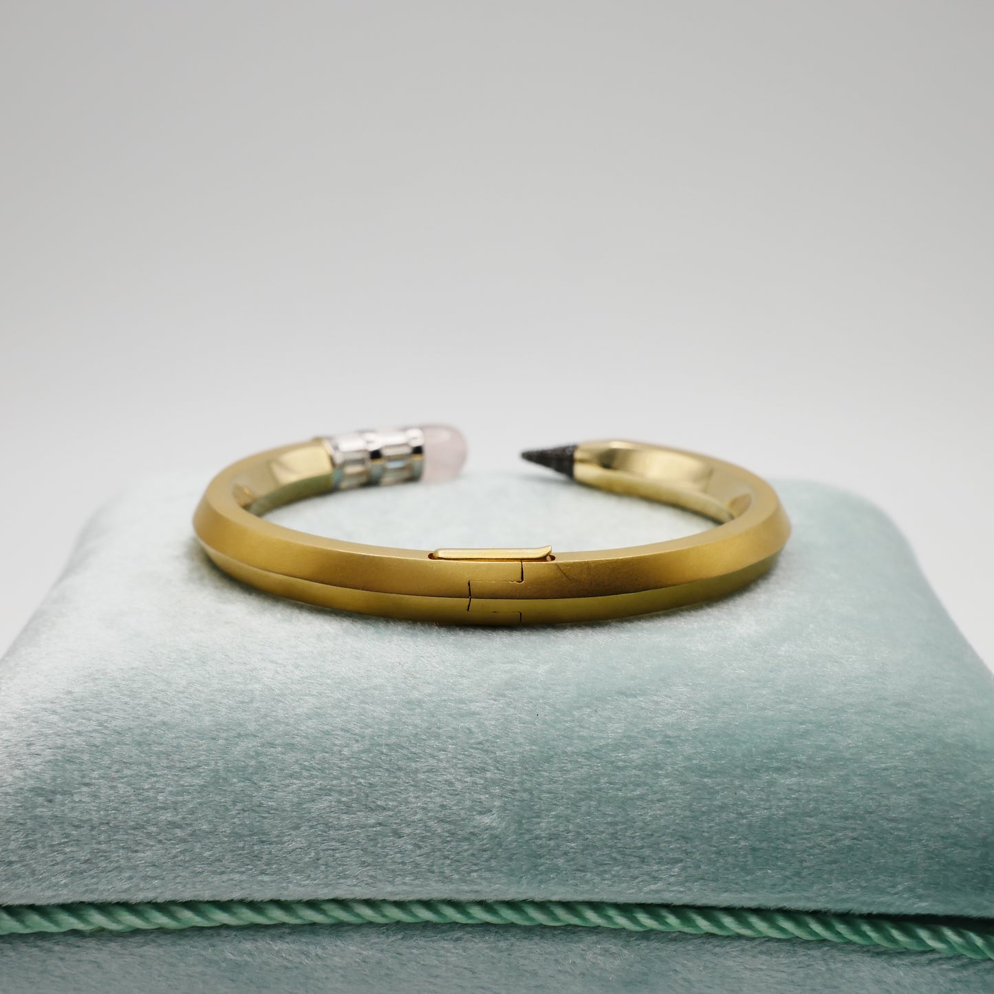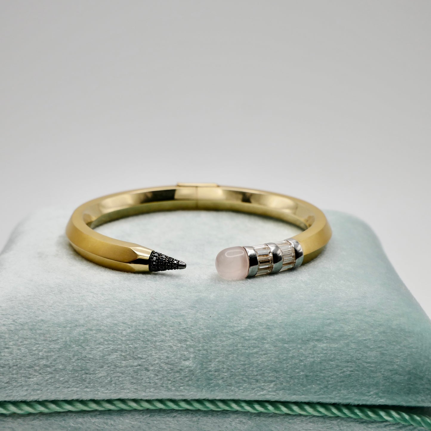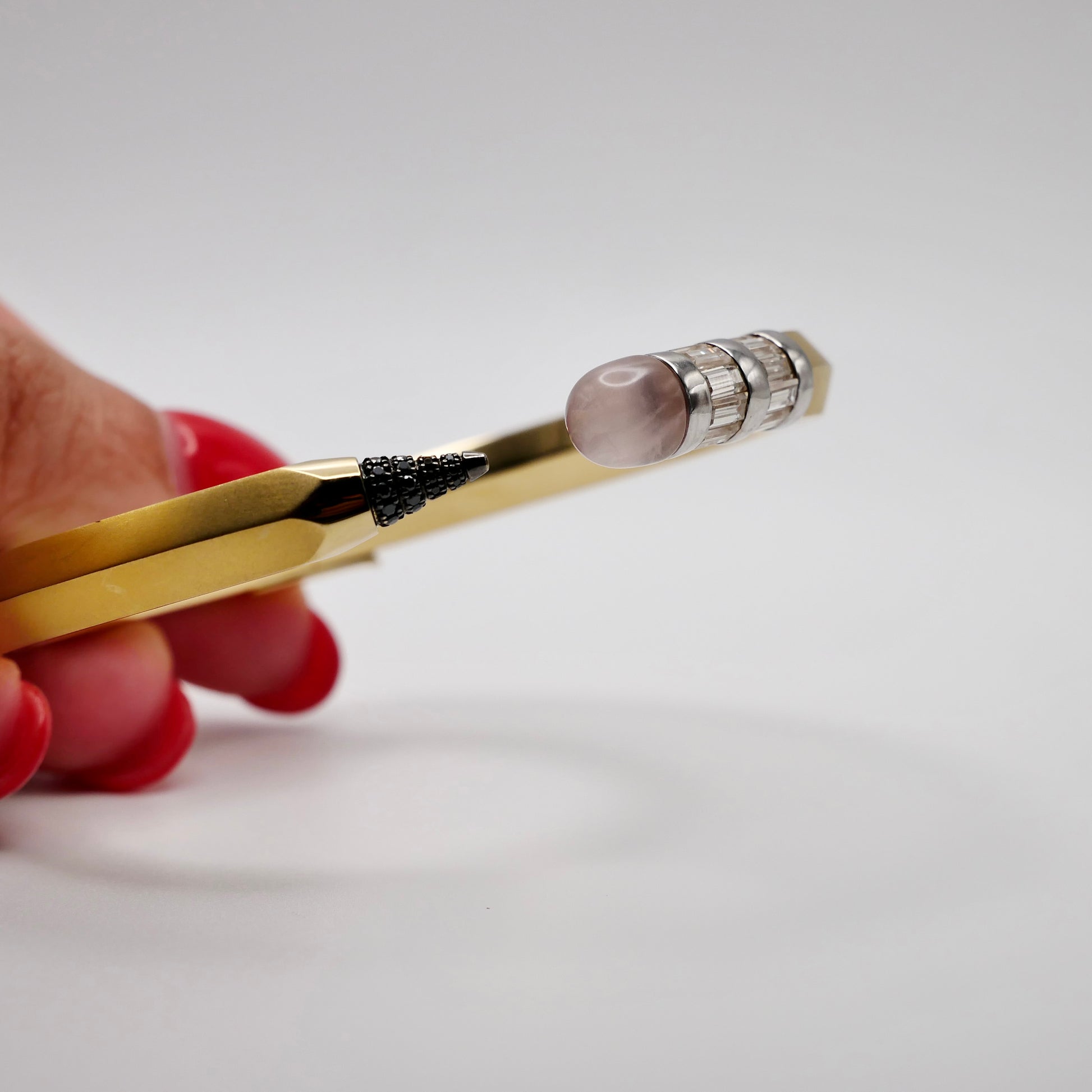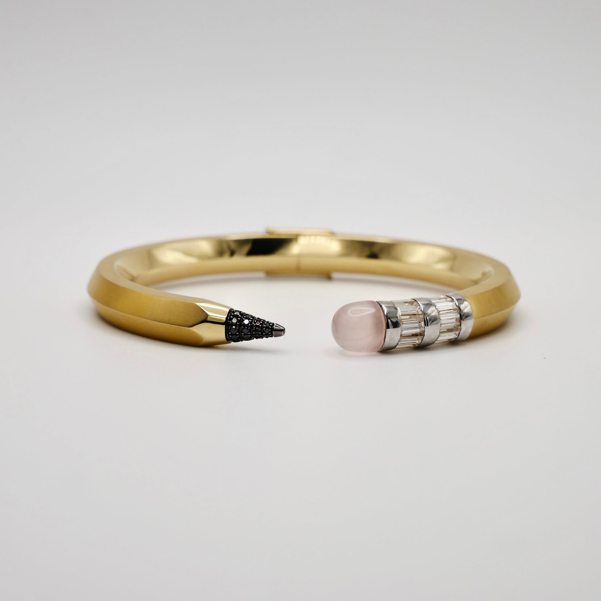This charming pencil bracelet is a delightful tribute to creativity. The clever design features sparkling white baguette moissanites and contrasting black moissanites that beautifully recreate the classic pencil look, topped with a genuine pink nephrite stone that adds a pop of color. The hinged bracelet opens smoothly for easy wear, combining the luxurious warmth of gold-filled metal with the brilliant sparkle of premium moissanites. Whether you're treating yourself or searching for an unforgettable gift, this whimsical piece celebrates the power of words and creativity in the most stylish way. It's guaranteed to spark conversations and bring a smile to anyone who appreciates the perfect blend of playfulness and elegance. Nadine Ghosn Pencil Bracelet Bangle