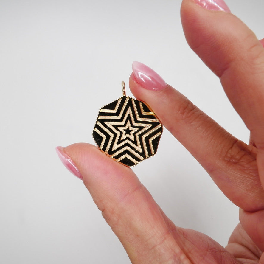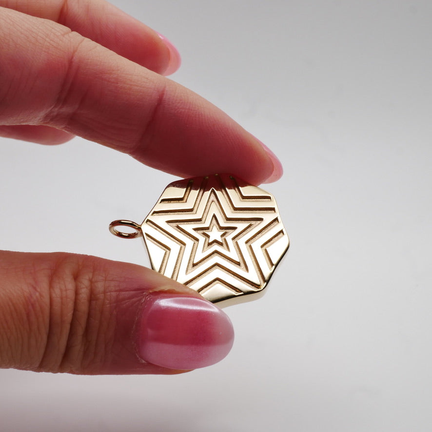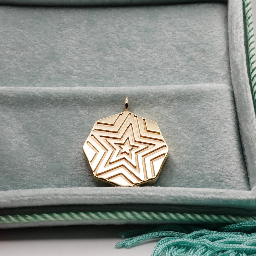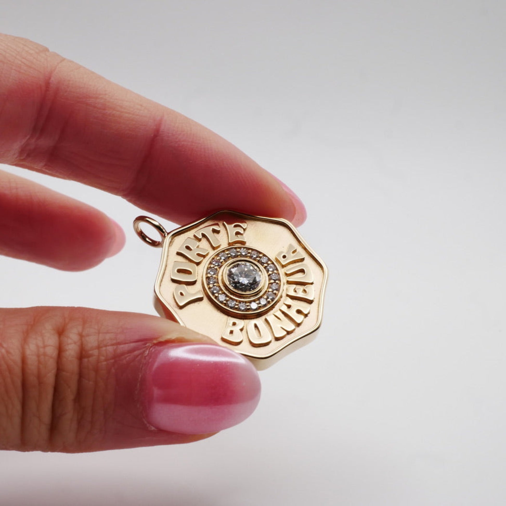 This exquisite double-sided pendant embodies the French concept of "porte bonheur" - a talisman that brings good fortune. One side features the words "PORTE BONHEUR" encircling a brilliant center moissanite surrounded by a halo of smaller stones, creating a radiant sun-like design. Flip it over to reveal a mesmerizing geometric star pattern with concentric hexagonal rays emanating from the center - a symbol of guidance and protection.