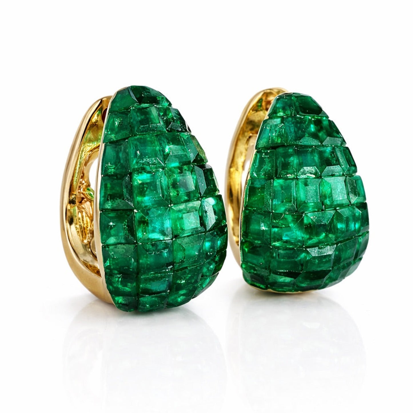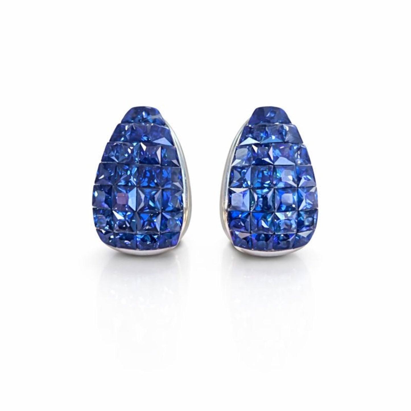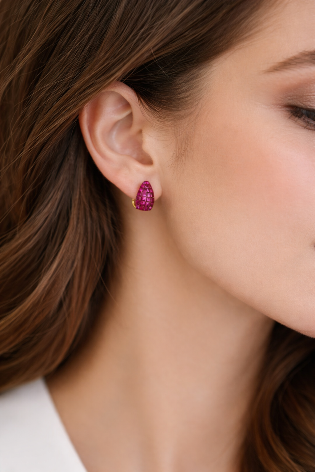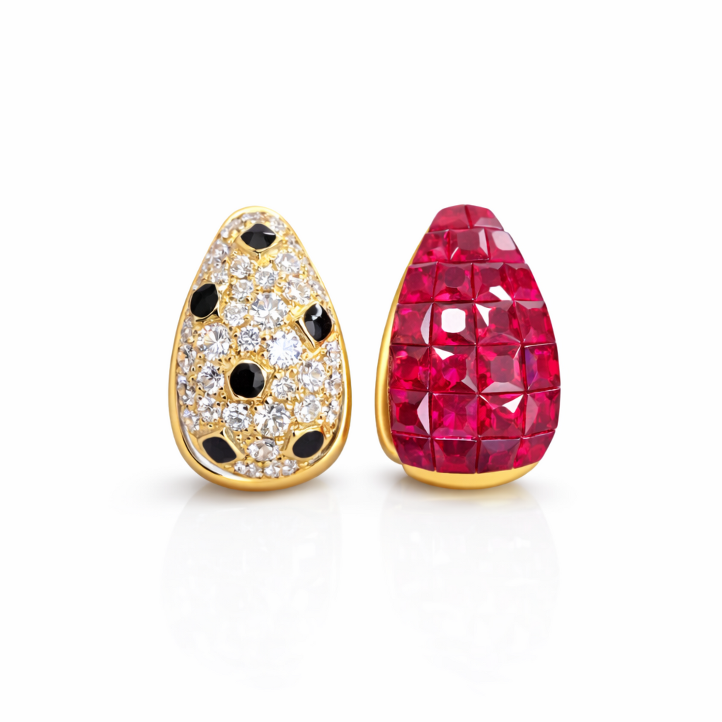 Experience the ultimate in versatility with these extraordinary reversible earrings featuring natural carré-cut rubies (or your choice of emeralds or sapphires) meticulously cut to follow the elegant teardrop silhouette. Each gemstone is individually shaped and invisibly set to create a seamless mosaic of brilliant color. Flip them to reveal your choice of two stunning reverses: brushed 18K gold adorned with sparkling lab diamond stars, or sophisticated pavé lab diamonds punctuated with dramatic black onyx accents. Available in yellow or white gold, these transformative earrings offer four distinct looks in one exceptional pair - from classic luxury to modern elegance with a simple flip.