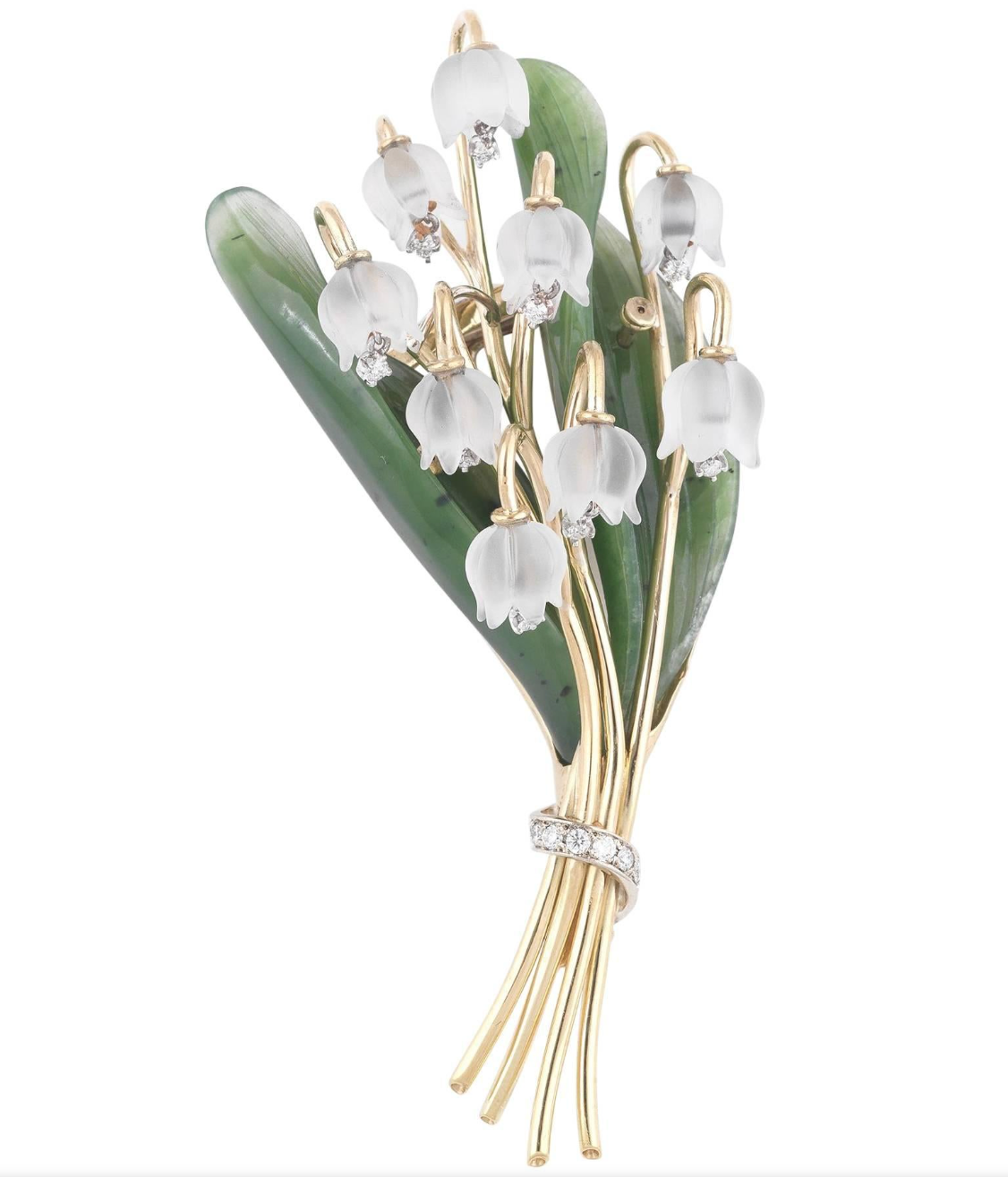 Rock Crystal, Diamond, Nephrite and 18K Gold Lily of the Valley Brooch