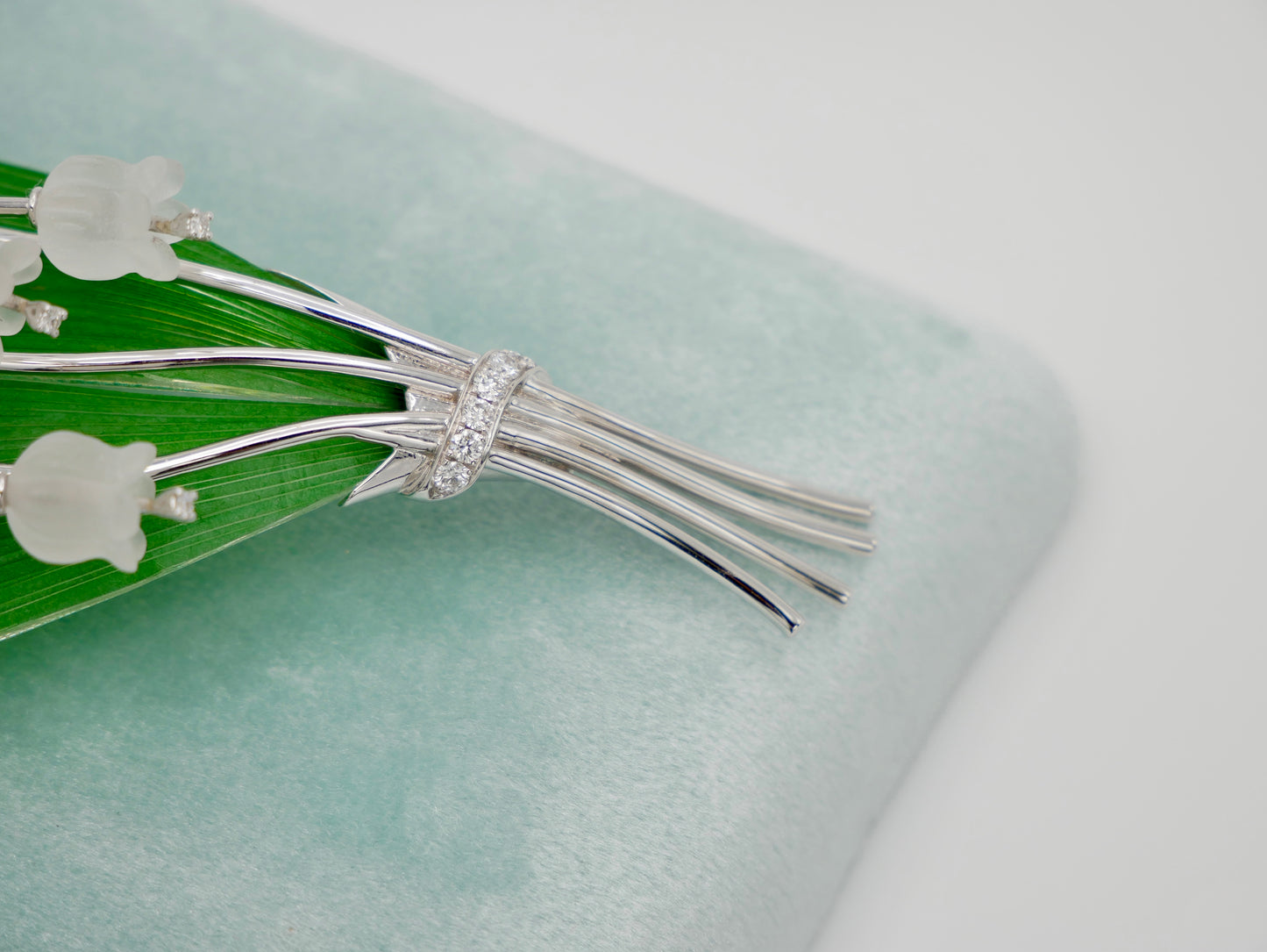 The pendant beautifully captures the essence of a lily of the valley stalk, showcasing exquisite craftsmanship and attention to detail. Delicately carved rock crystal flowers adorn the piece, each suspending a sparkling lab-grown diamond for added brilliance. The design features a couple of intricately carved jade or nephrite leaves, adding a touch of natural elegance. The stems are accentuated by a line of precisely cut lab-grown diamonds, enhancing the overall luminosity of the pendant. This stunning piece is available in your choice of 18K yellow gold, white gold or rose gold.