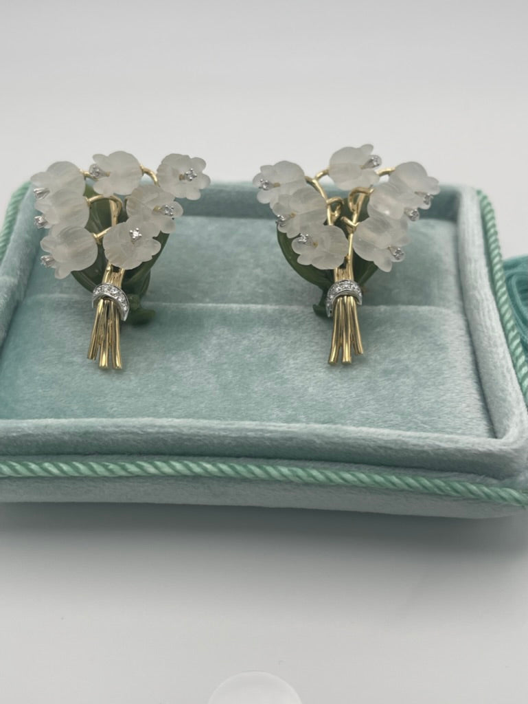 Rock Crystal, Diamond, Nephrite and 18K Lily of the Valley Earrings, Antique Inspired