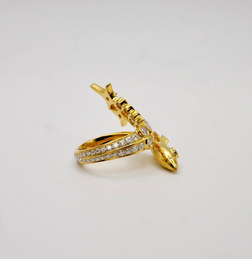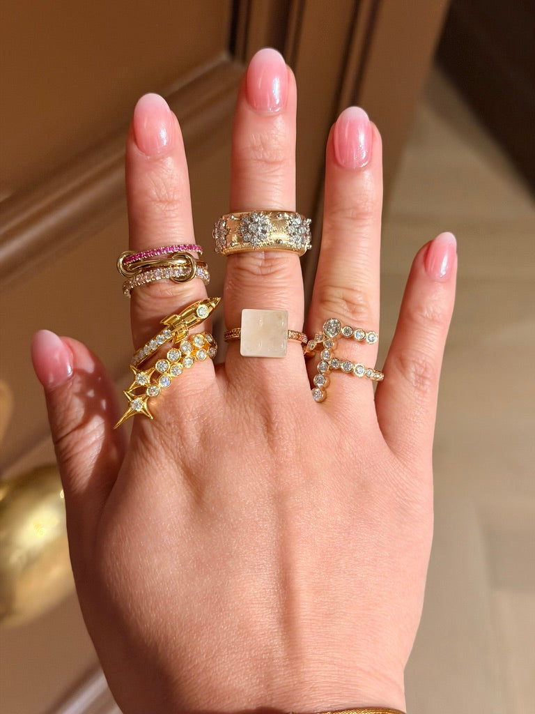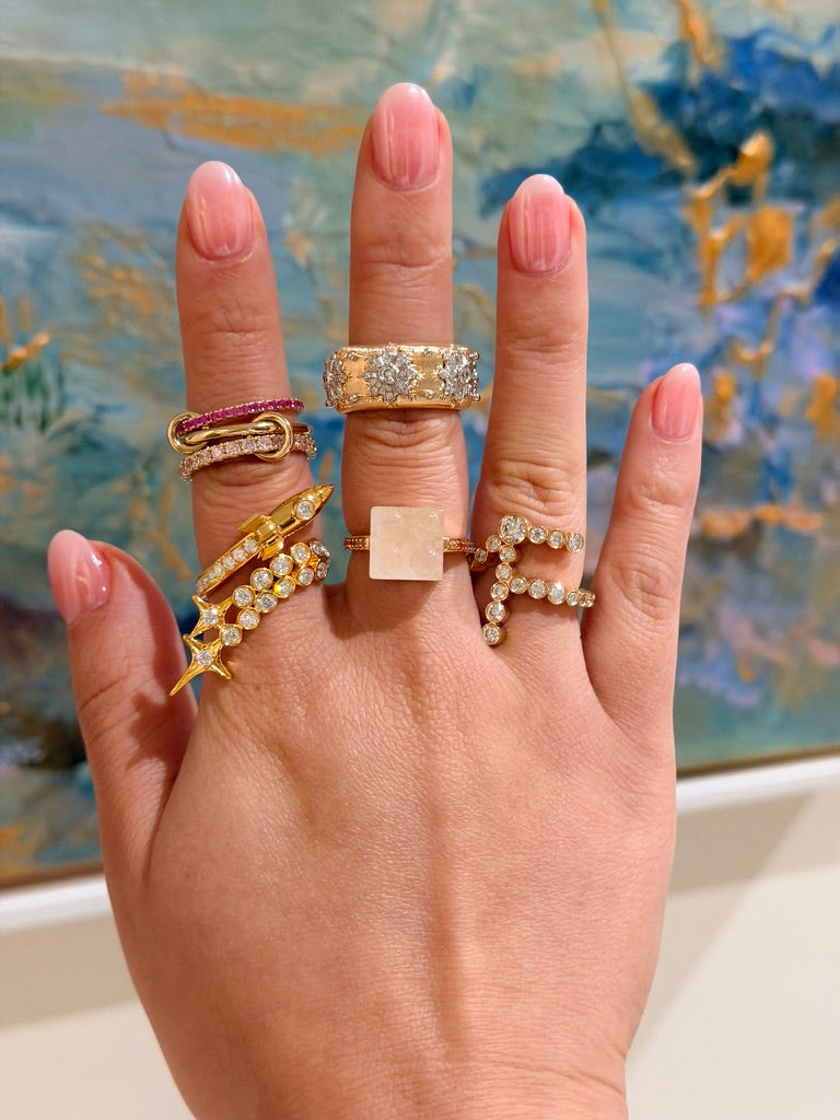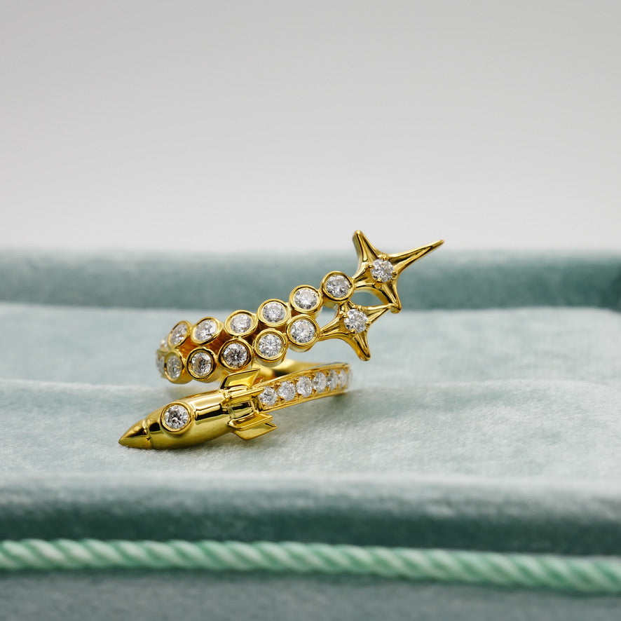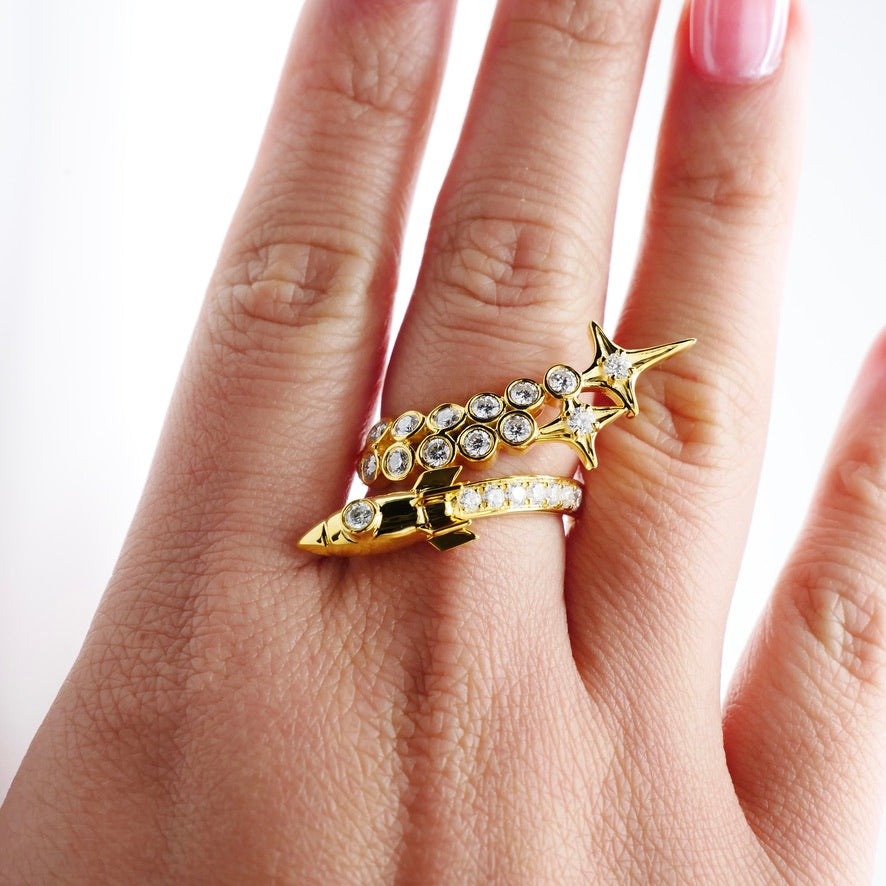This celestial-inspired wrap ring captures the magic of a shooting star in motion, featuring a sleek rocket ship racing through a sparkling trail of moissanites. Crafted in 18K gold-filled metal, the bypass design wraps elegantly around the finger with two rows of bezel-set moissanites forming the star trail, while larger stones create prominent stars at each end. The polished rocket features moissanite-studded details that catch the light beautifully from every angle. Perfect for dreamers and space enthusiasts, this adjustable ring brings cosmic whimsy to everyday elegance. The dynamic spiral design ensures comfortable wear while creating visual movement that changes as you move your hand. Sybarite Fly Me To The Moon Ring