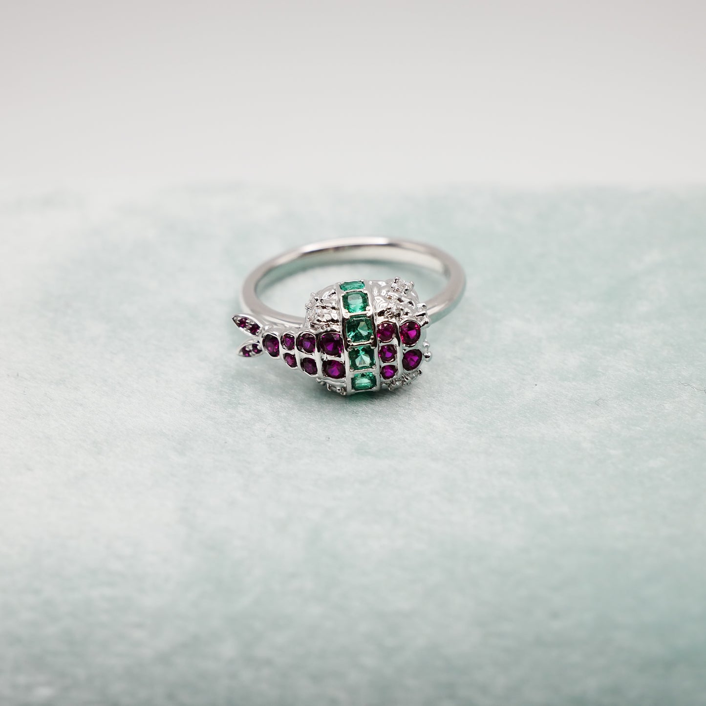 Shrimp Sushi Ring in 14K White Gold with Lab Rubies, Emeralds and Moissanites
